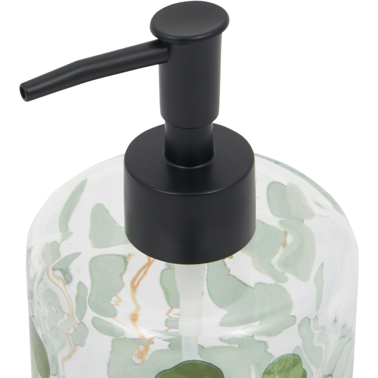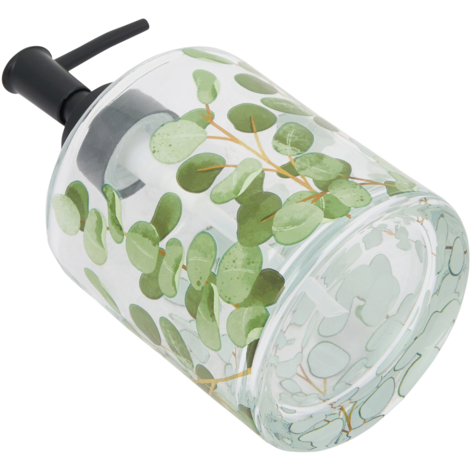 Bring some botanical charm into your bathroom with this Eucalyptus Glass Soap Dispenser. It features a clear glass body with an ornate print of eucalyptus leaves and a black dispenser mechanism for a chic look. Ideal for storing hand soap, it'll make a stylish yet practical addition to your space.