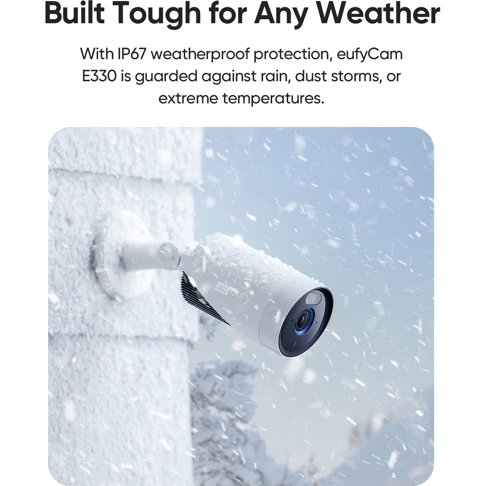 Capture every detail in stunning 4K HD, day or night. With this ultra-sensitive sensor and colour night vision, you'll enjoy crystal clear, vibrant footage even at night. Experience swift and effortless event reviews with Cross Camera Tracking. Unlock the true potential of your security facial recognition differentiates between family and strangers. Enjoy the convenience of plug-in power with the 5 m (16.4 ft) cable and enjoy uninterrupted 24/7 recording. No power worries, just seamless security at your fingertips. Stable Wi-Fi coverage that reaches every corner of your home (up to 464 m² / 5,000 ft²), avoiding security blind spots caused by Wi-Fi dropouts or insufficient Wi-Fi coverage. Wireless connectivity works at distances up to 25 m (82 ft) between cameras and HomeBase 3, allowing easy DIY installation anywhere power is available. Save Months of 24/7 Security Footage With eufyCam E330, your data is protected with advanced encryption, and you're always in control. HomeBase 3 offers expandable storage up to 16 TB, all for no monthly fee.