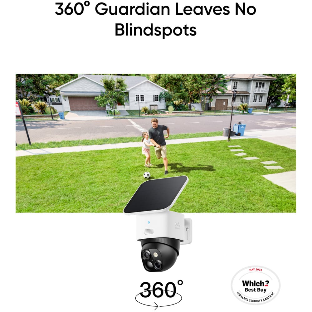 Upgrade your home security with the eufy S340 SoloCam Solar Camera. This camera provides all-around, high-definition home security with 3K Ultra-clear resolution and 8x zoom, capturing every detail up to 50 feet away. Equipped with dual cameras, it offers a wide view while allowing you to focus on essential details. The 360° surveillance eliminates blind spots, keeping an eye on the front porch, backyard, and driveway effortlessly. Powered by a removable solar panel, this camera runs continuously, requiring minimal maintenance. With local storage and no monthly fees, it is a one-time investment in security. The compact, wire-free design allows for a quick, five-minute installation. Please note: Compatible with HomeBase S380 with firmware version V3.3.2.6 and above.