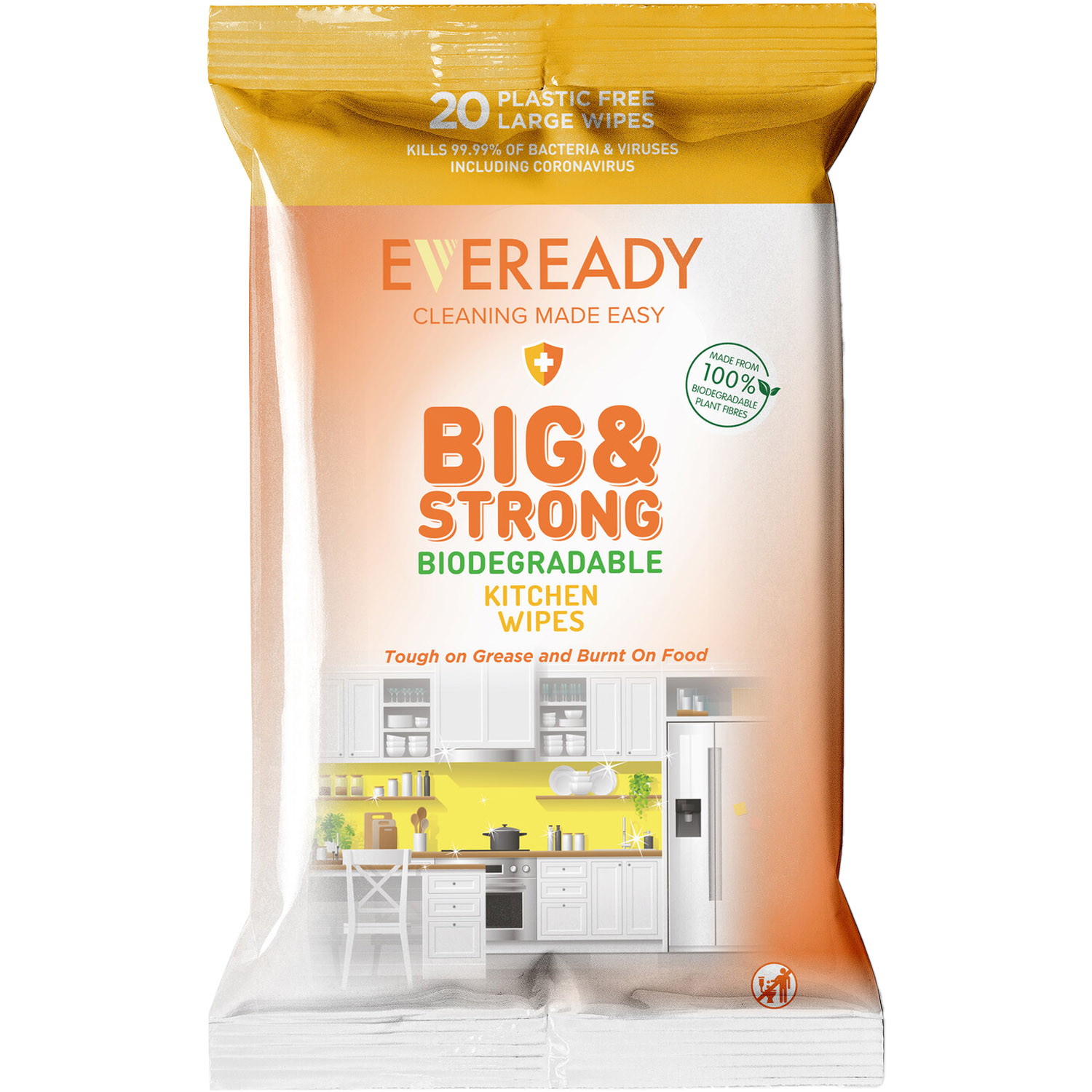 Eveready Big & Strong Biodegradable Kitchen Wipes help to make cleaning your kitchen easy. The large wipes are tough on grease on burnt-on food, helping to leave your kitchen surfaces and appliances sparkling clean. They kill 99.9% of bacteria and viruses, including coronavirus. They're made from 100% biodegradable plant fibres and are ideal for everyday cleaning.