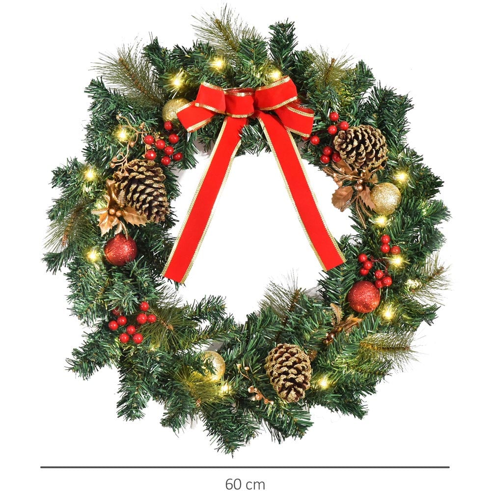 Brighten your holidays with Everglow 's 60cm lighted LED-lit Christmas Wreath! This beautiful and realistic-looking wreath is embellished with 144 branch tips and 20 warm LED lights. It provides a festive glow to your home, so you can use this beautiful wreath indoors or outdoors. This Christmas wreath is trimmed with red berries, pine cones, golden balls, red ribbon, glitter and more. Whether you hang it on a door, in a window, or along a staircase, you'll have a great time celebrating in the festive spirit. Measuring 60cm with 144 branch tips, it adds a natural look to your holiday décor without all the hassle of a real wreath. Pre-strung with 20 energy-efficient and long-lasting warm white LED lights, using it is a breeze, simply insert three AA batteries (not included).