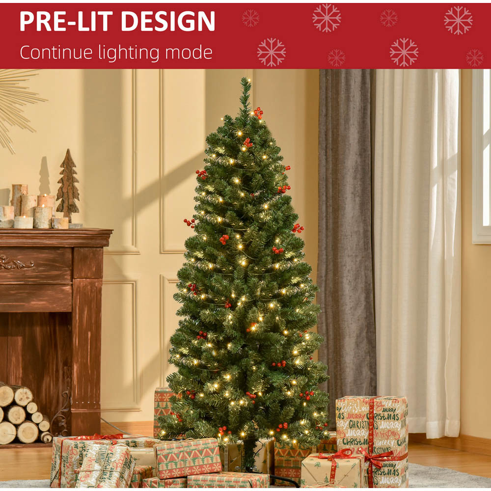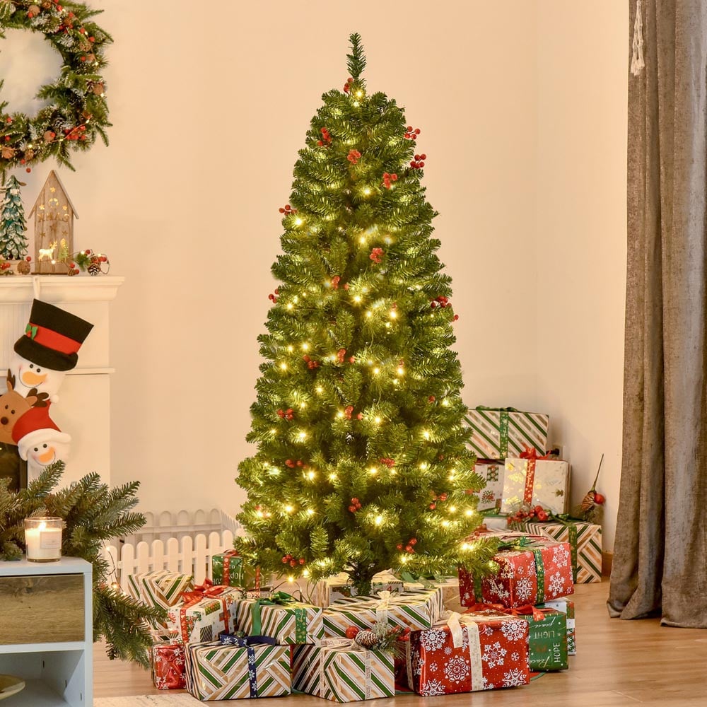 Everglow Warm White LED Pre-Lit Pencil Green Artificial Christmas Tree with Red Berries 5ft