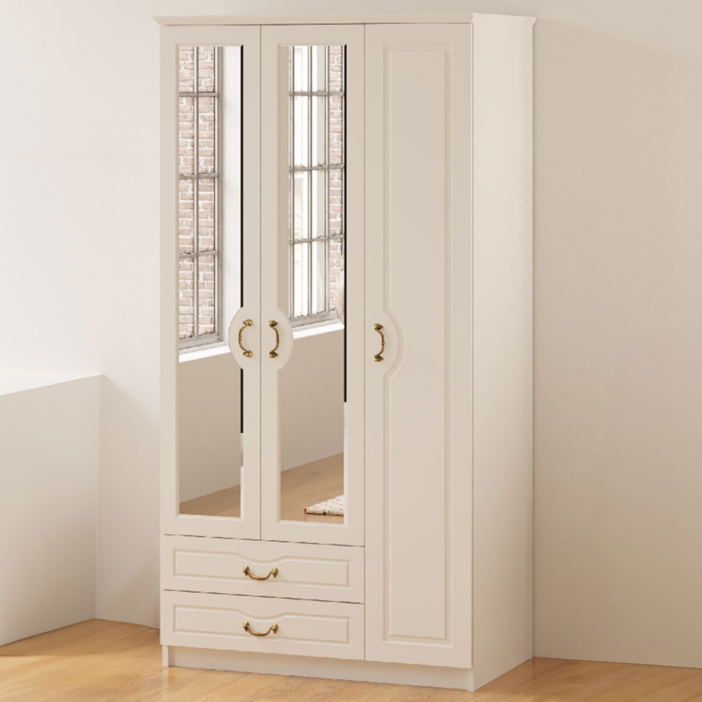 Add elegance to your living space with this ANNE Wardrobe by Evu. Finished with a CNC process, this white-coloured wardrobe features a French-inspired design with a matt finish. It features three doors with mirrors and two drawers complemented by inner shelves and a hanging rod with antique gold handles. The wardrobe offers ample storage space for your clothes and other essentials. With its membrane coated from MDF board, this wardrobe can perfectly enhance your interior. Please note all boxes are sent out with next day/ white-glove two MAN service and delivered to your room of choice. Also, in the UK mainland, the next day or two days and in remote areas, two to five days.