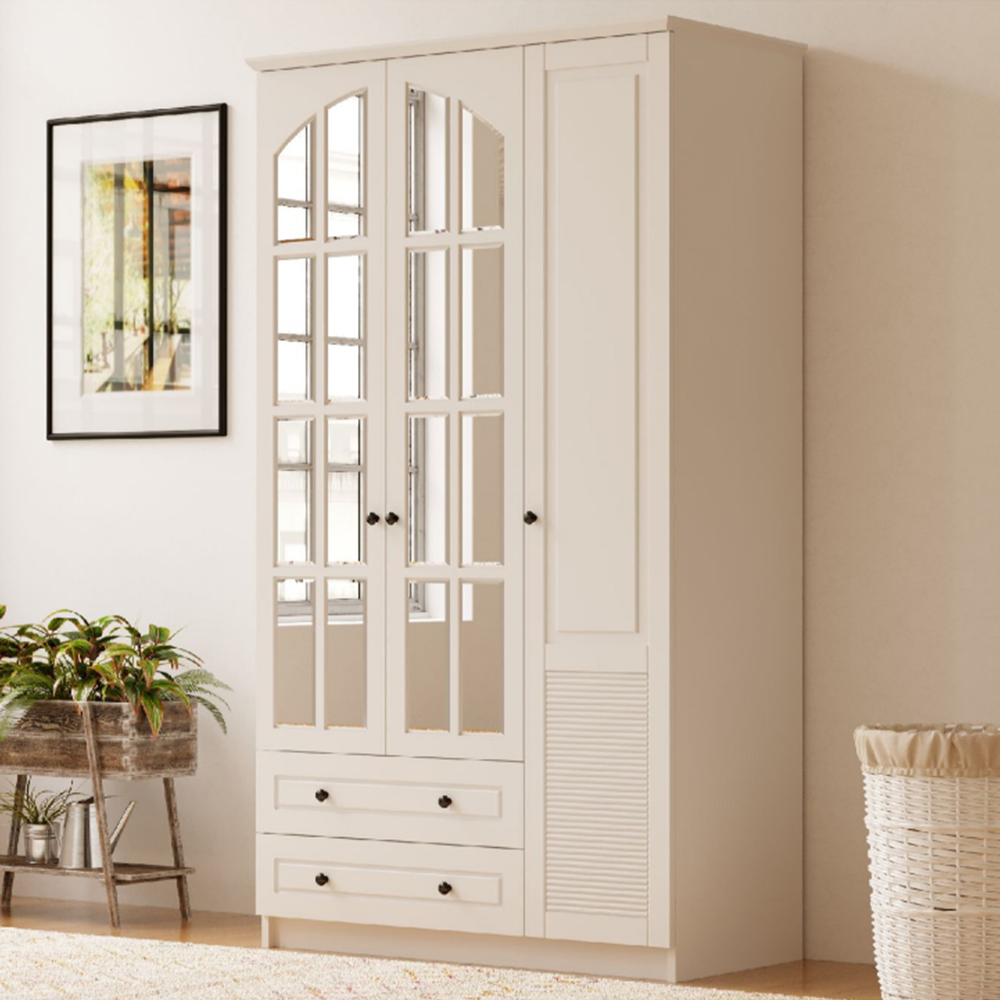 Organise your indoors with the Evu Elise 3-door 2-drawer White Mirrored Wardrobe. Featuring two drawers and three doors, this wardrobe offers ample storage space for your clothes, accessories, shoes and more. Boasting a French-inspired design, the unit is sure to blend well with a range of decor styles. Also, its classic window-style mirrored doors add style and elegance to your space. Plus, solid and durable, it is crafted with CNC techniques to make a reliable choice. Please note: All boxes are sent out with next-day or white-glove two-man service and delivered to your room of choice. UK Mainland: Next day or two days, Remote areas two to five days.