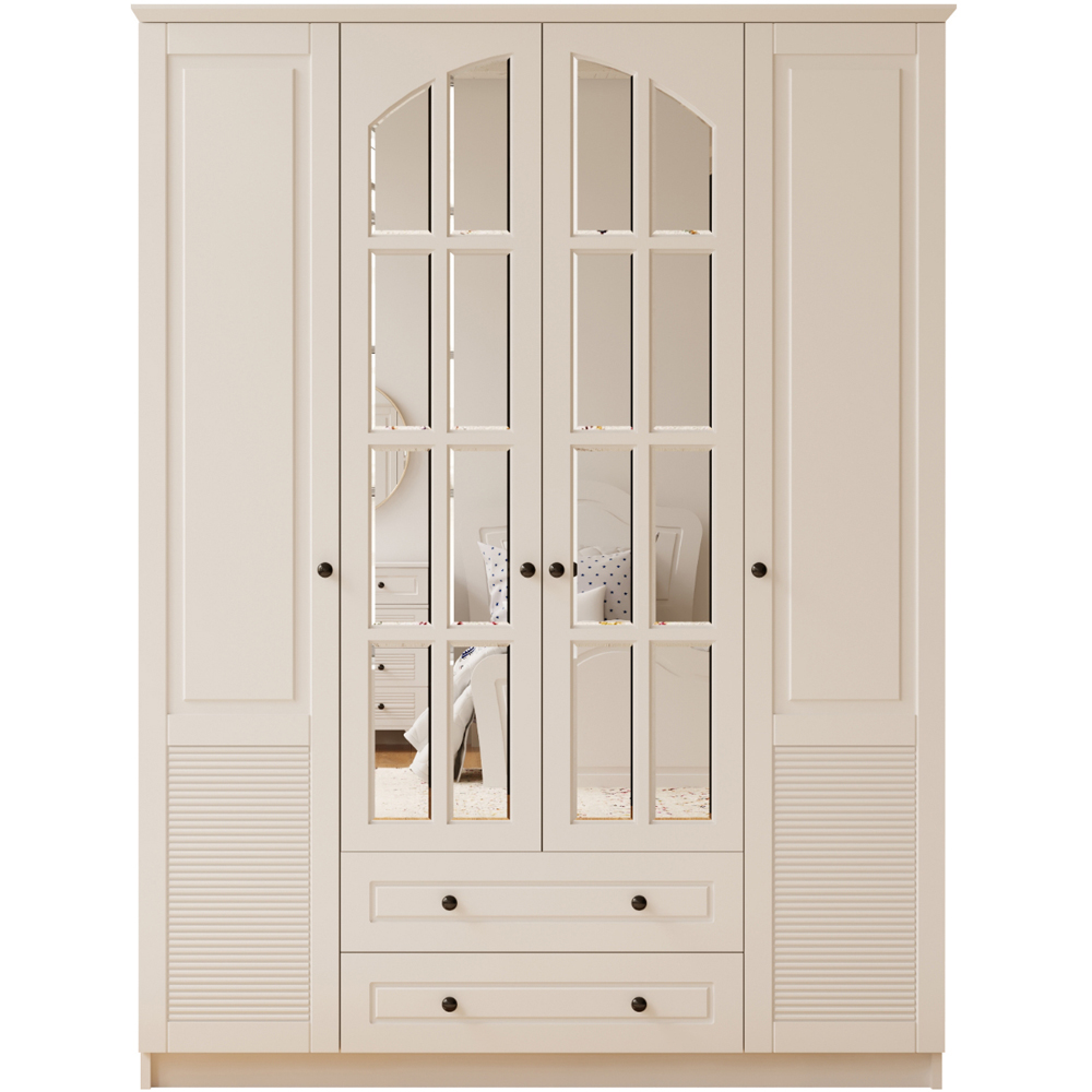 Organise your indoors with the Evu Elise 4 Door 2 Drawer White Mirror Wardrobe. Featuring two drawers and four doors, this wardrobe offers ample storage space for your clothes, accessories, shoes and more. Boasting a French-inspired design, the unit is sure to blend well with a range of decor styles. Also, its classic window-style mirrored doors add style and elegance to your space. Plus, solid and durable, it is crafted with CNC techniques to make a reliable choice. Please note: All boxes are sent out with next-day or white-glove two-man service and delivered to your room of choice. UK Mainland: Next day or two days, Remote areas two to five days.