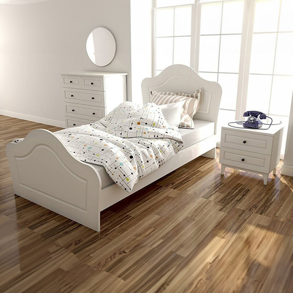 Add elegance to your living space with this MAISON Bedroom Set by Evu. Finished with a CNC process, this white-coloured set has a French-inspired design with a matt finish. It features a bed, a four-door wardrobe, a two-drawer side table and a five-drawer storage chest, offering an aesthetic look to any room interior. The set also provides ample storage for your clothes and other daily essentials. This set can perfectly enhance your interior with its membrane coated from the MDF board. It is also delivered in flat packaging for hassle-free assembly.