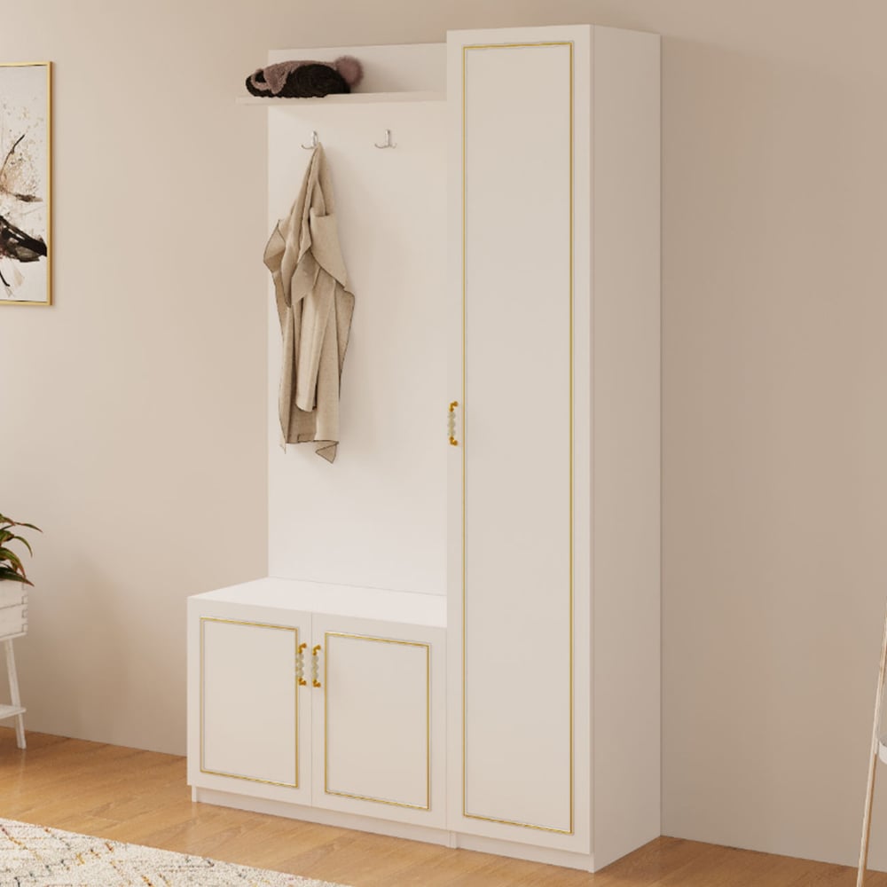 Keep your hallway clutter-free and create space for hanging your coats with the Evu MARIE Hallway Unit. This white colour unit has impressive gold colour detailing with sleek handles. It features a three-door design with enclosed storage shelves for your shoes and essentials. This unit is designed to complement all types of modern and traditional interior spaces. Please note: All boxes will be sent out by the next day with a white-glove two-man service and will be delivered to your room of choice. UK Mainland: Next day or two days. Remote areas two-five days.