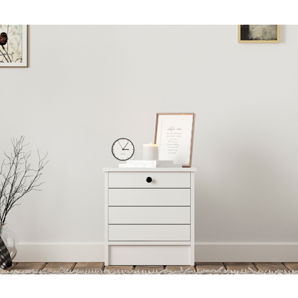 Make your bedroom decor more delightful with the Evu SABRO Bedside Table. This white colour bedside table features a smooth top for keeping your alarm clock or a display item and a single-door design with an enclosed shelf. It also features a sleek handle with a sturdy base for stability and support. This bedside table is suitable for all types of contemporary and traditional interior spaces. Please note: This product is delivered flat packed, assembly is required.