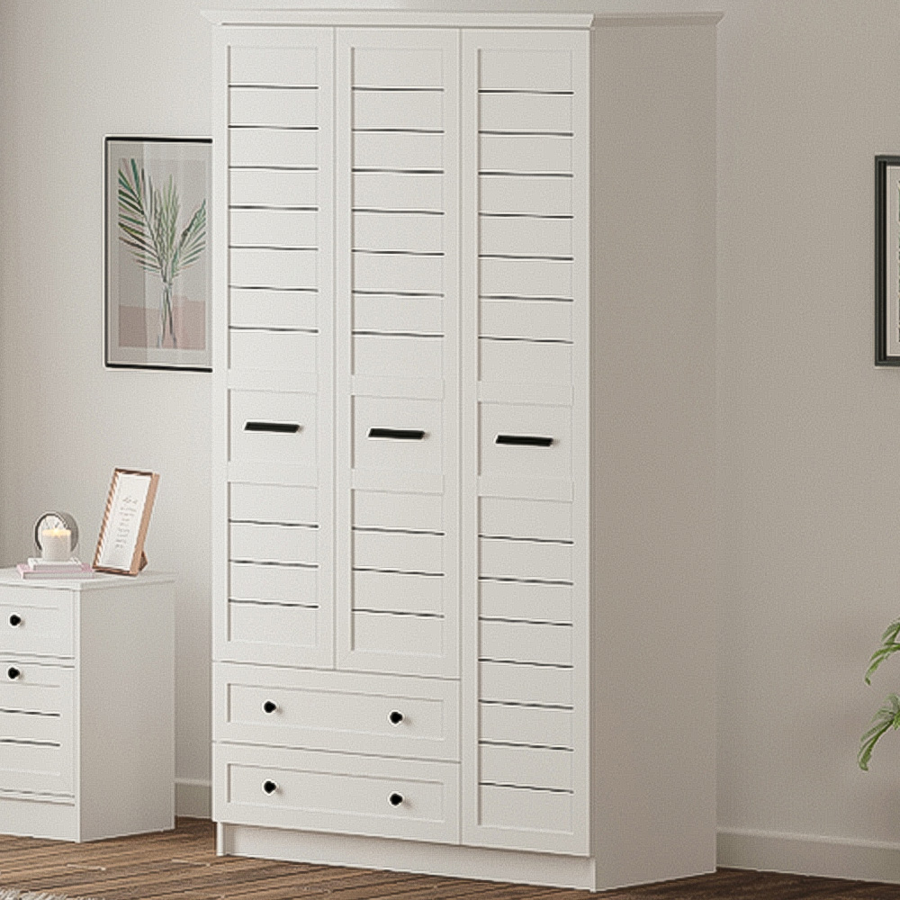 Add a touch of class to your living space with this VENICE Wardrobe by Evu. Finished with a CNC process, this white-coloured wardrobe features a French-inspired design with a matt finish. It features three doors and two drawers complemented by inner shelves and a hanging rod with sleek black handles. The wardrobe offers ample storage space for your clothes and other essentials. This wardrobe can perfectly enhance your interior with its membrane coated from the MDF board. Please note all boxes are sent out with next day/ white-glove two MAN service and delivered to your room of choice. Also, in the UK mainland, the next day or two days and in remote areas, two to five days.