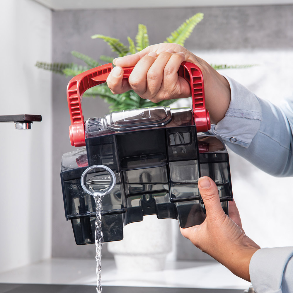 Clean your carpets and rugs with this Ewbank HydroC1 Black and Red Carpet Cleaner. With a 1.6L clean water tank and a 1.8L dirty water tank, the machine's dual water tank technology makes it easier for the user to empty them and continue using the machine. It also features a handy trigger that releases clean water and carpet cleaning solution on the floor area, ready to wash and leave a spotless finish. Lightweight, the cleaner weighs 5.7kg and is easy to manoeuvre around the home. Apart from this, with on-tool cable storage, the device is user-friendly and perfect for homes.