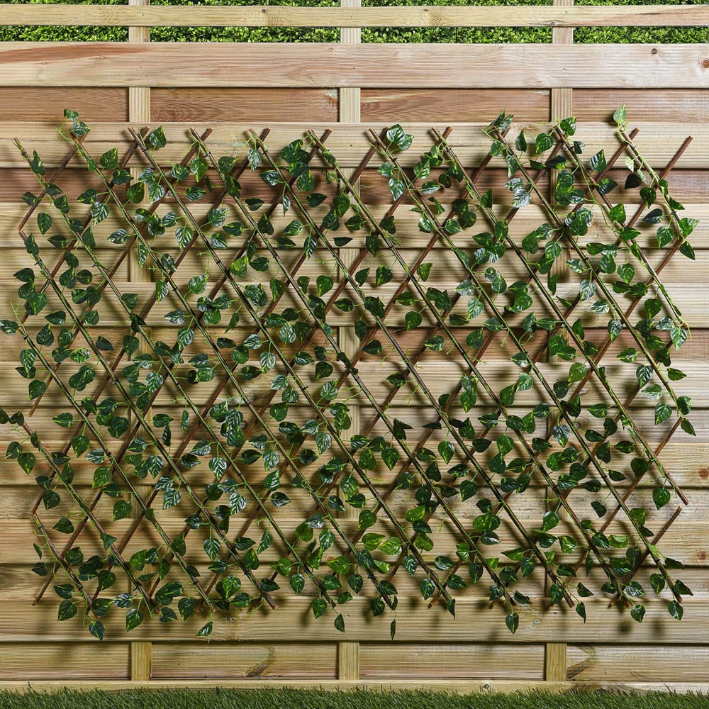 A great way to hide unsightly areas of your garden, this Expanding Sweet Pea Trellis is extremely easy to use. Designed with faux sweet pea leaves on an expanding wooden trellis, this is great for additional privacy and is UV stabilized for outdoor use. Easy to install, simply pull to extend over your area.