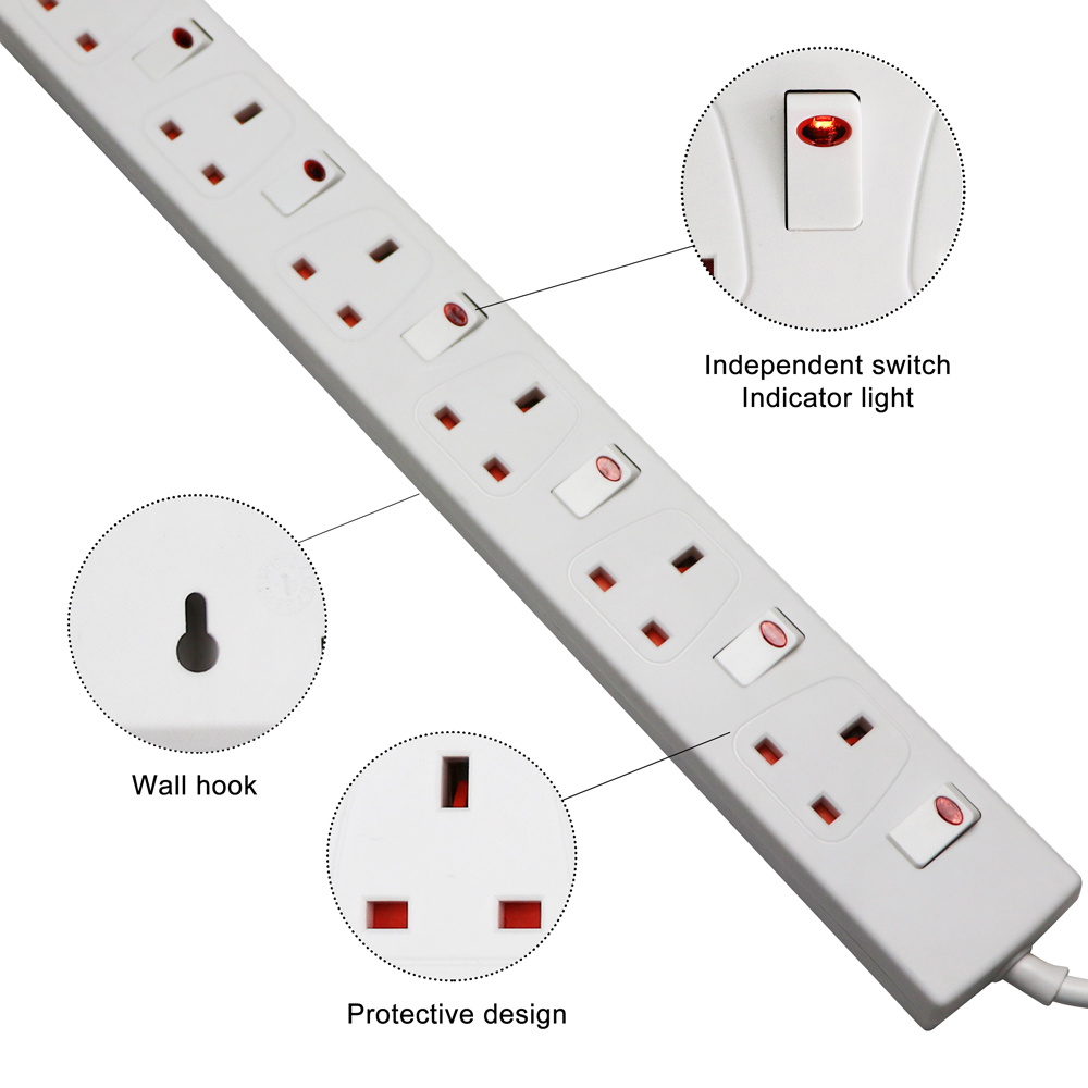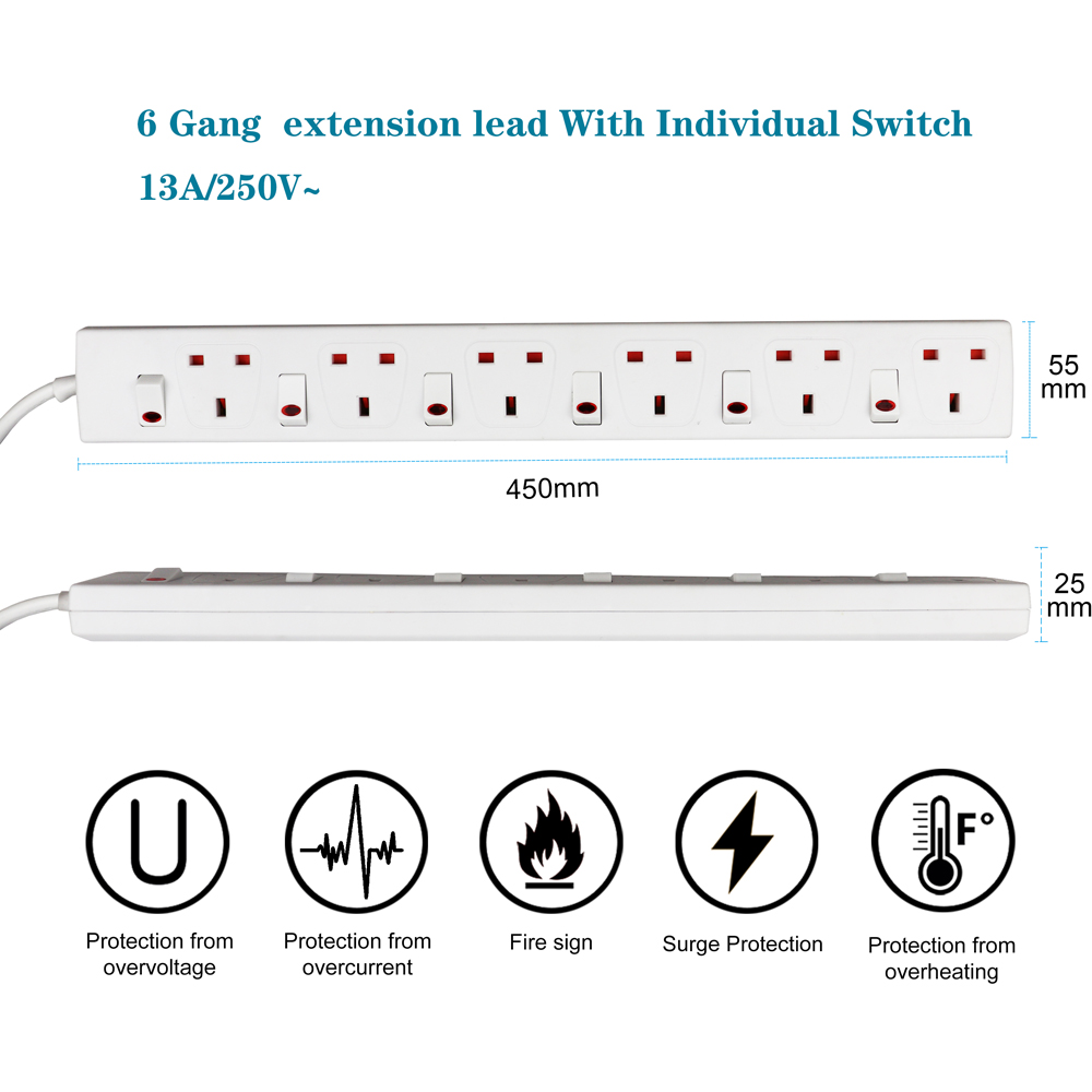 Extrastar 6-Gang Individually Switched Extension Lead (1m, white) is a practical and efficient power solution for home, office, or workspace use. Designed for convenience and safety, it features four sockets, each with its own individually switch, allowing you to control devices independently and reduce unnecessary power consumption. The built-in power indicator ensures a clear visual status when the extension lead is in use. With a durable 1-metre cable, it provides flexibility while keeping your space organised.