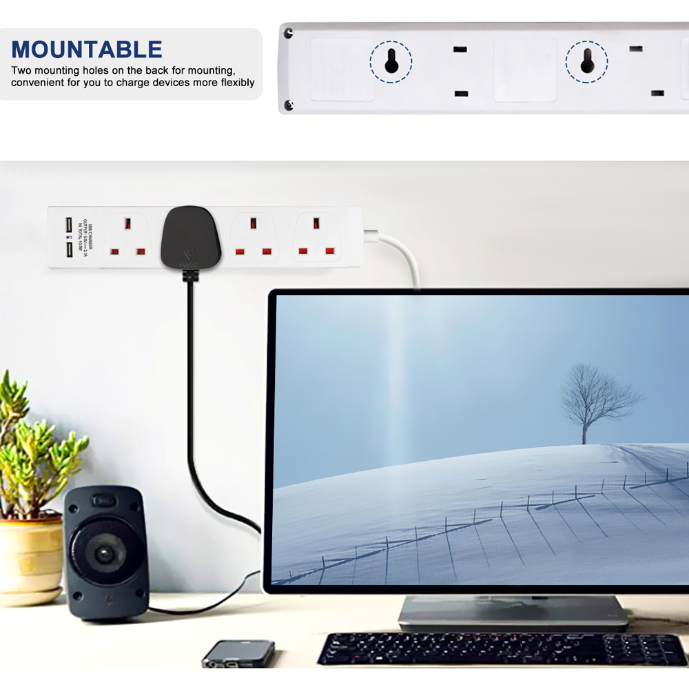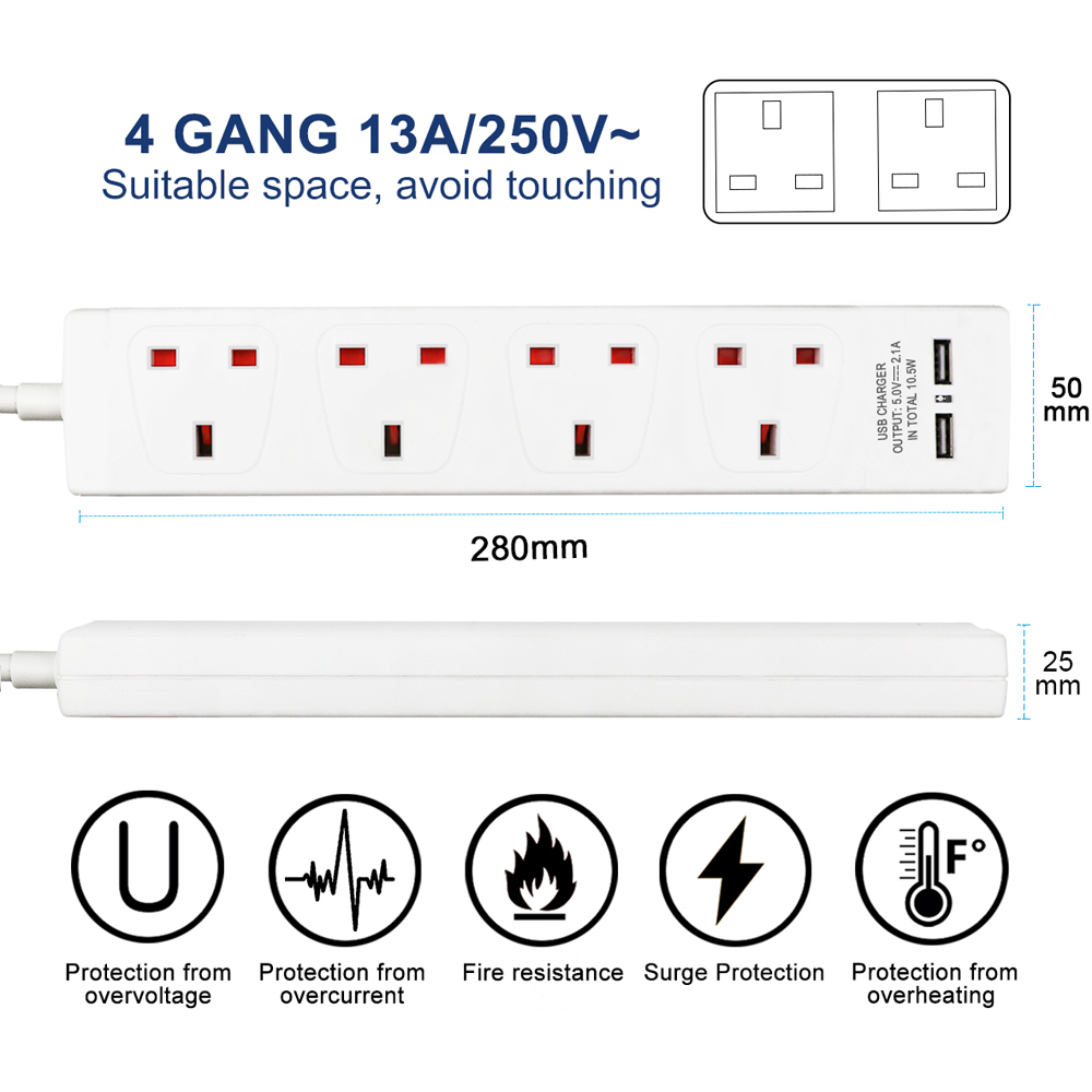 - Features 4 power sockets and 2 USB ports
