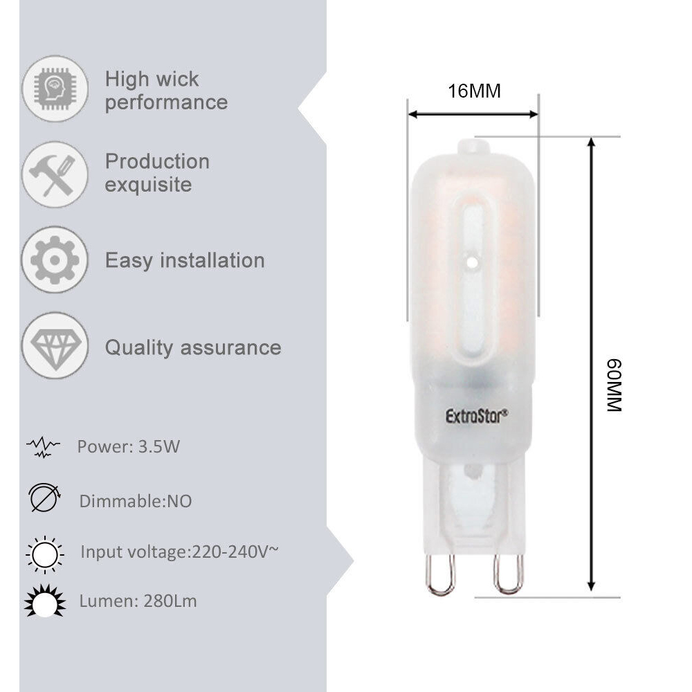 Extrastar 3.5W G9 Mini LED Bulb delivers warm white illumination (3000K) in a compact and energy-efficient design. Perfect for chandeliers, cabinet lighting, wall sconces, and decorative fixtures, this bulb provides flicker-free, instant full brightness while significantly reducing energy consumption. Designed as a long-lasting alternative to traditional halogen bulbs, it ensures consistent and reliable performance with minimal heat output. The G9 bi-pin fitting allows for quick and easy installation, making it an ideal choice for both home and commercial lighting applications. Upgrade to the Extrastar 3.5W G9 LED Bulb for a efficient lighting solution.
