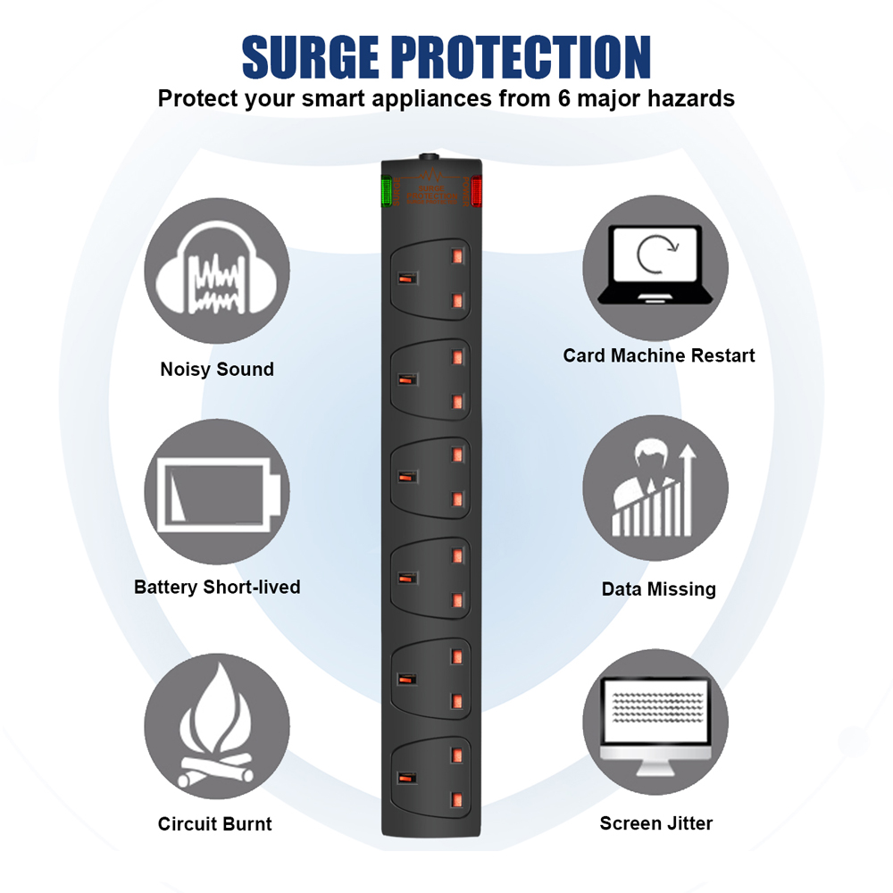 ExtraStar 6-Gang Unswitched Surge Protected Extension Lead (2m, Black) is a safe and reliable power solution for your home, office, or workspace. Designed with built-in surge protection, it helps safeguard your electrical devices against unexpected power spikes and surges. The surge and power indicators provide a clear visual status, ensuring safe and efficient operation. With a durable 2-metre cable, this extension lead offers extended reach and flexibility for your power needs.
