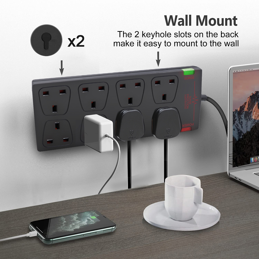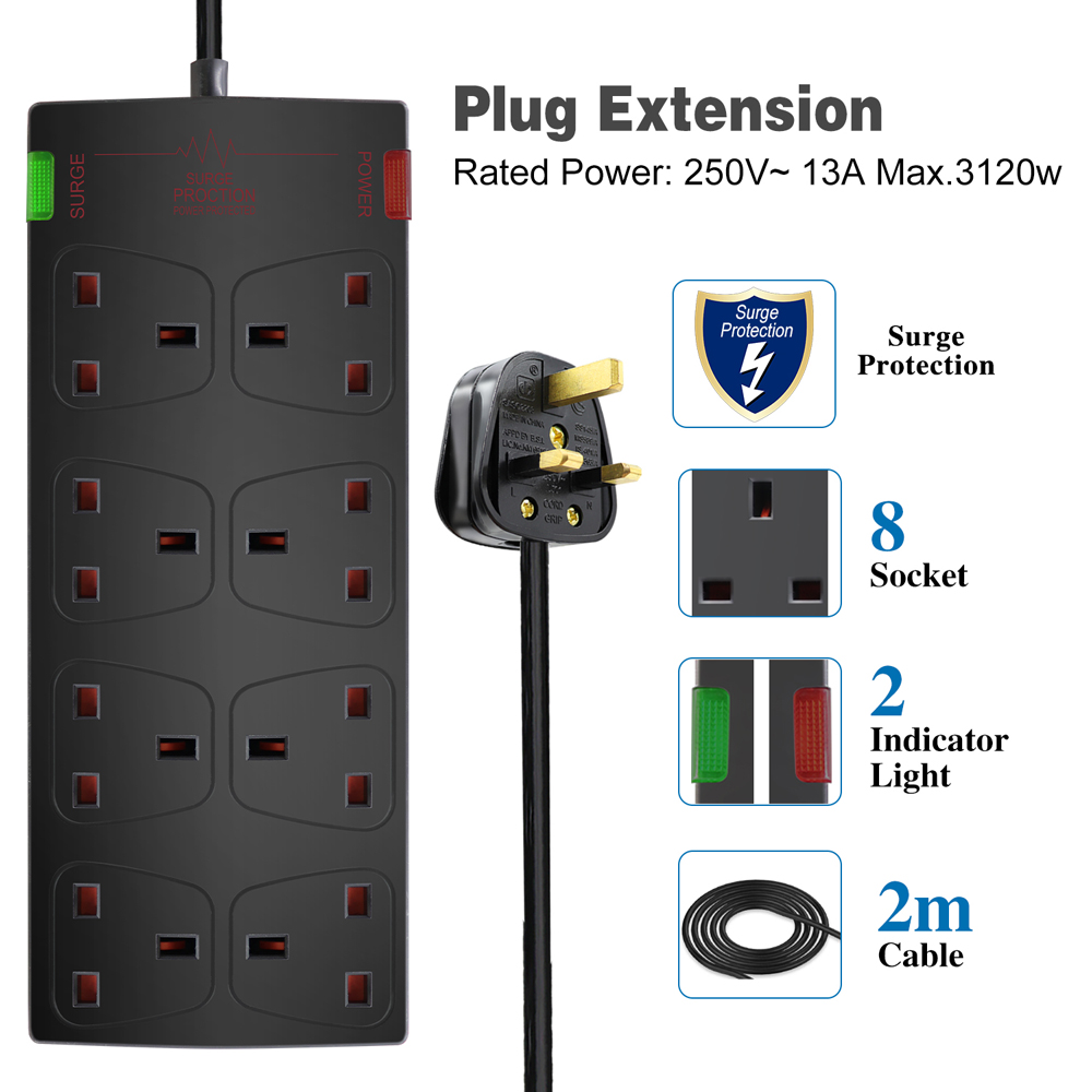 ExtraStar 8-Gang Unswitched Surge Protected Extension Lead (2m, Black) is a safe and reliable power solution for your home, office, or workspace. Designed with built-in surge protection, it helps safeguard your electrical devices against unexpected power spikes and surges. The surge and power indicators provide a clear visual status, ensuring safe and efficient operation. With a durable 2-metre cable, this extension lead offers extended reach and flexibility for your power needs.
