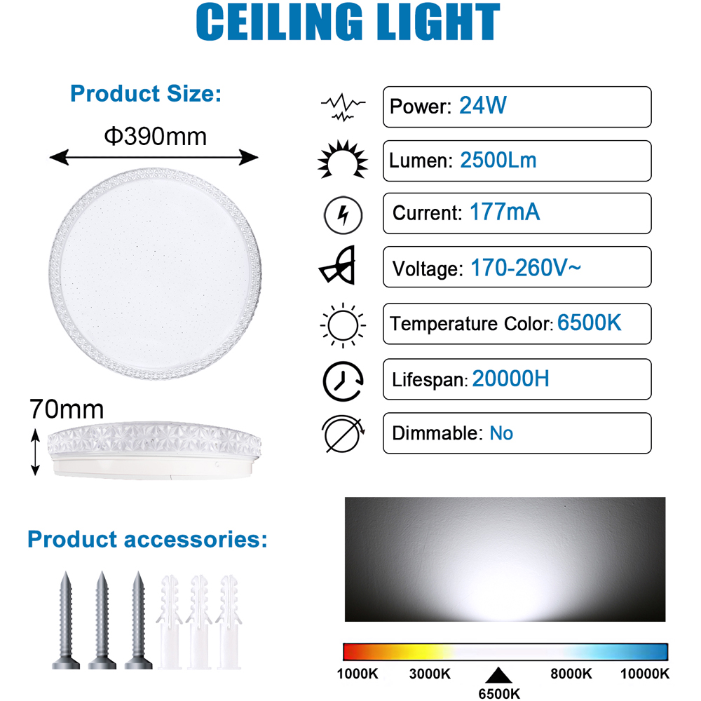 ExtraStar 24W Round LED Ceiling Light (Model: AD390C) features a decorative acrylic crystal edge, delivering 2500 lumens of brightness at 6500K cool white. Its sleek design is perfect for modern spaces, combining style with energy-efficient lighting. The light provides a wide 120° beam angle and is ideal for both residential and commercial applications, ensuring long-lasting performance with a lifespan of 20,000 hours.
