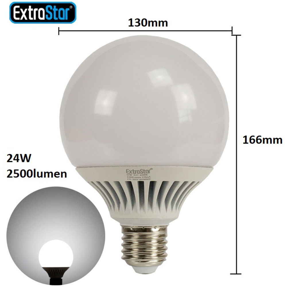Extrastar 24W LED G130 Ball Bulb provides powerful and efficient illumination with a cool white 6500K glow, ideal for large spaces such as living rooms, offices, shops, and commercial areas. Designed as an energy-saving alternative to traditional incandescent bulbs, it offers high brightness with reduced power consumption, helping to lower electricity costs. The E27 screw fitting ensures easy installation, while the long-lasting LED technology provides flicker-free and reliable performance. With its oversized G130 globe shape, this bulb delivers wide and uniform light distribution, making it a practical and stylish lighting solution for any setting.