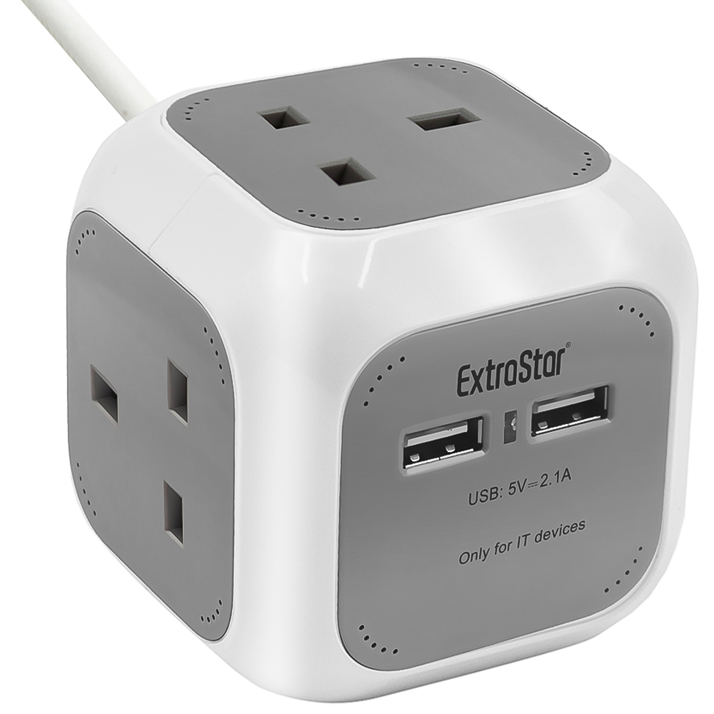 ExtraStar 4 Gang Cube Extension Lead with two USB Ports is a versatile and compact power solution for your home or office. This extension lead features four UK standard sockets, allowing you to connect multiple devices simultaneously. Additionally, it includes two USB ports, providing convenient charging options for your smartphones, tablets, or other USB-powered devices. The 1.5m cable offers flexibility in device placement, and its grey finish ensures it complements various interior styles. Designed for durability and reliability, this extension lead meets everyday electrical needs efficiently.