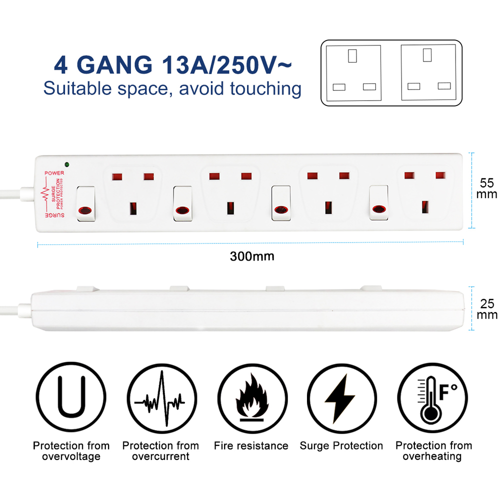 ExtraStar White 13A 2m 4 Socket Individually Switched Surge Protected Extension Lead