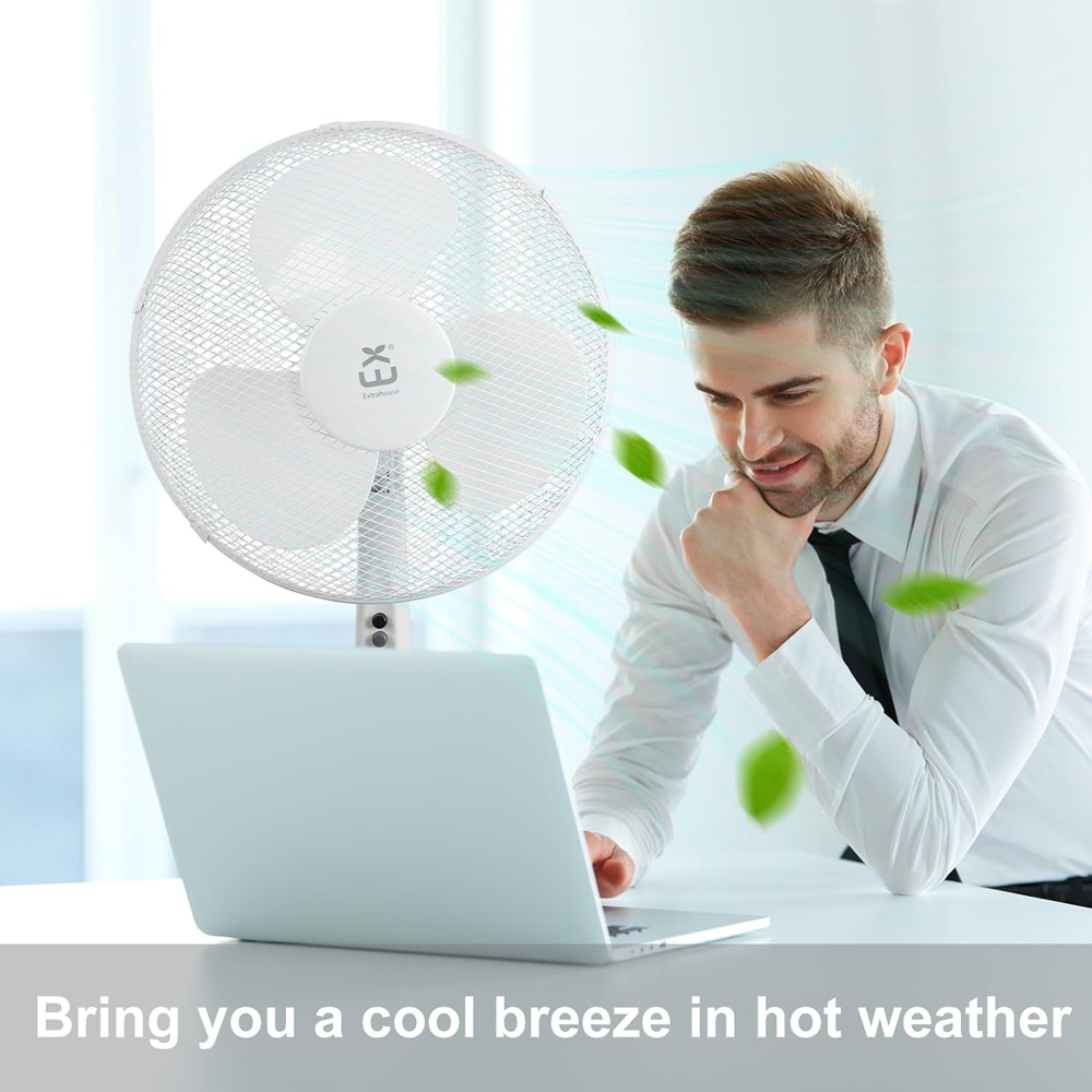 Stay cool and comfortable with the Extrastar 16-Inch Stand Fan. Designed for efficient airflow, this 40W fan features a large round stand base for enhanced stability. Its adjustable height and tiltable head allow you to direct airflow where you need it most. With multiple speed settings, you can customise the cooling experience to suit your preference. The sleek white design blends seamlessly with any home or office décor, making it a stylish and practical addition to your space.