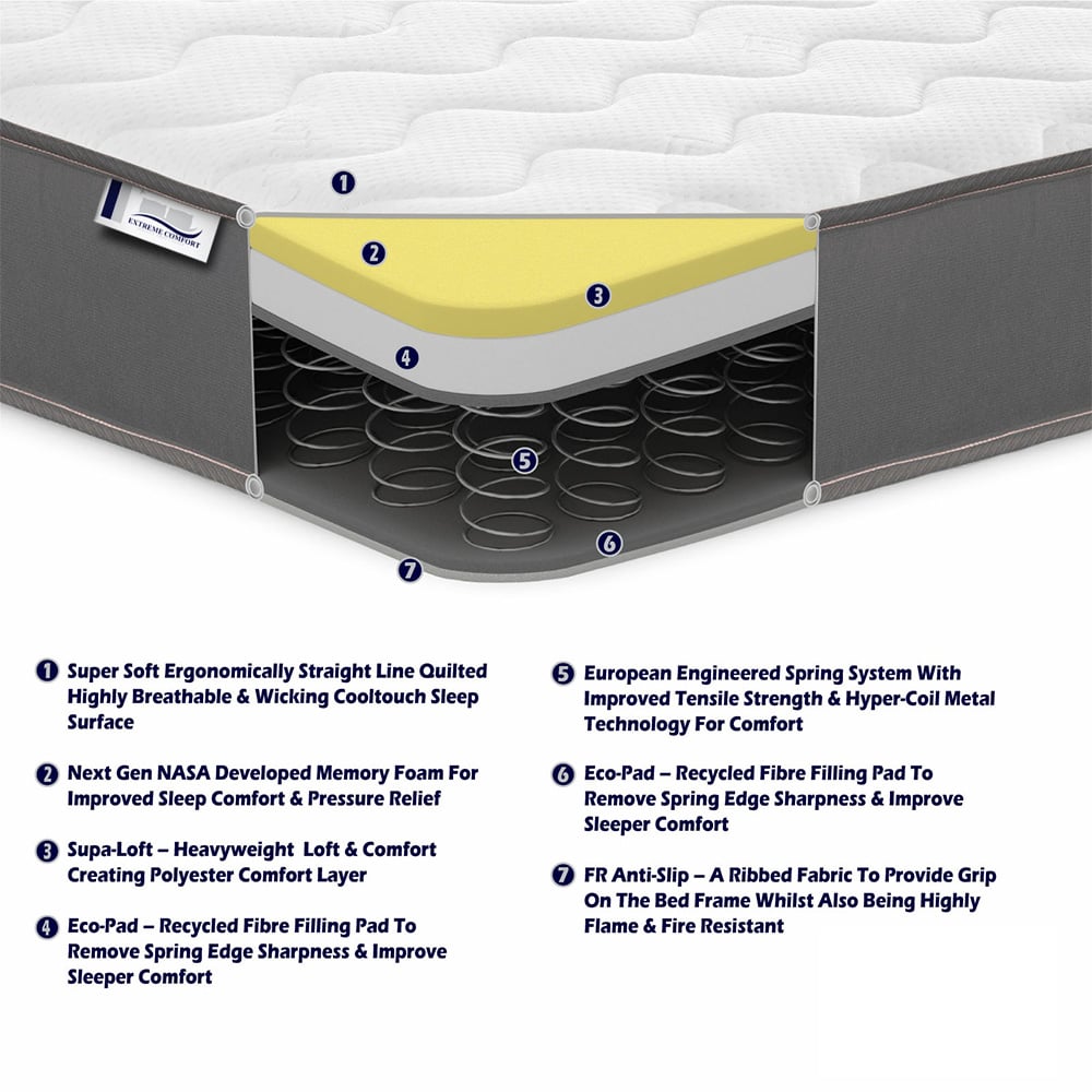 The design construction of this Extreme Comfort Cooltouch Colours Small Double Grey Memory Foam and Spring Mattress is perfectly suited for kids' beds, bunk beds, spare rooms, guest beds, lofts, and apartments or as a low-cost excellent-value mattress option for everyday use. Extreme’s Cool Touch Core top cover fabric provides luxuriously soft comfort, cosiness and is also highly breathable - helping body temperature regulation; preventing overheating whilst sleeping. It is quilted in a different colour fabric to best suit your interior colour. This mattress is hand-made by experienced craftsmen at eXtreme Comfort's West Yorkshire mattress factory and is fully compliant with all relevant UK fire safety regulations for domestic use.