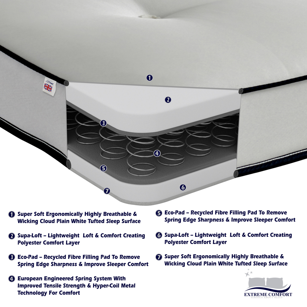 Built around a double-insulated 13.5 gauge open coil spring unit, this mattress from Extreme Comfort has a soft feel from the layers of comfort paddings on both sides. Ideal for bunk beds, cabin beds, trundles, triple sleepers etc. Excellent first proper mattress for a child too Covered in a tufted white daisy damask with a matching quilted border and contrasting black tape edging, this mattress should be turned and rotated regularly to maximise comfort and mattress lifespan. This UK-made mattress is fully compliant with all relevant UK fire safety regulations. (BS 7177: 2008 for domestic use (low hazard)). This mattress is compressed, vacuum packed, rolled, and boxed for ease of handling and delivery. It will require a couple of hours to air to size. Size: European Single. Dimensions: 90 x 200cm.