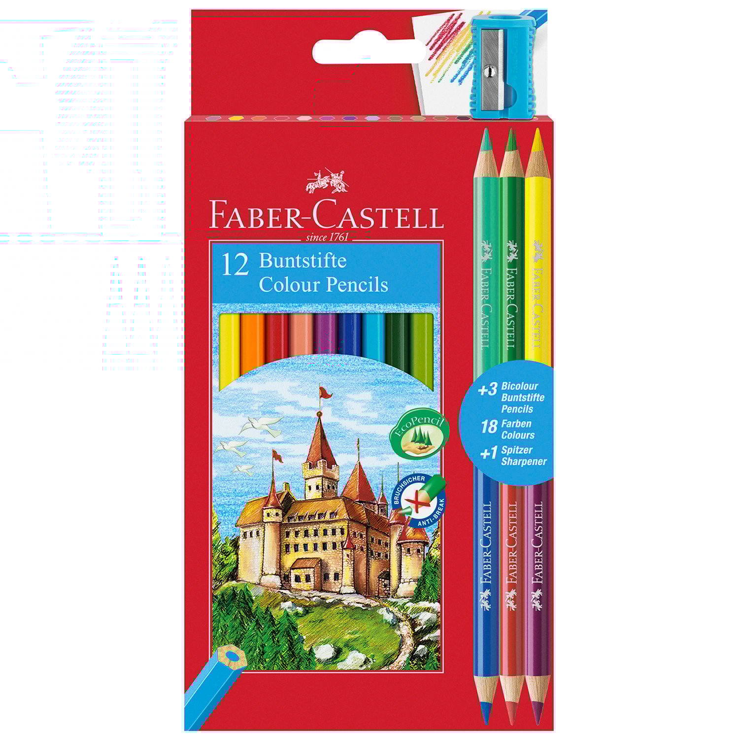 The Pack of 12 Buntstifte Colour Pencils from Faber-Castell are a classic set of pencils in a standard comfortable hexagonal shape. They feature vivid colour pigment and have been put through a special bonding process to make them break-resistant. Additionally, this set comes with 3 bi-colour pencils and a sharpener for an incredible 19 pieces.