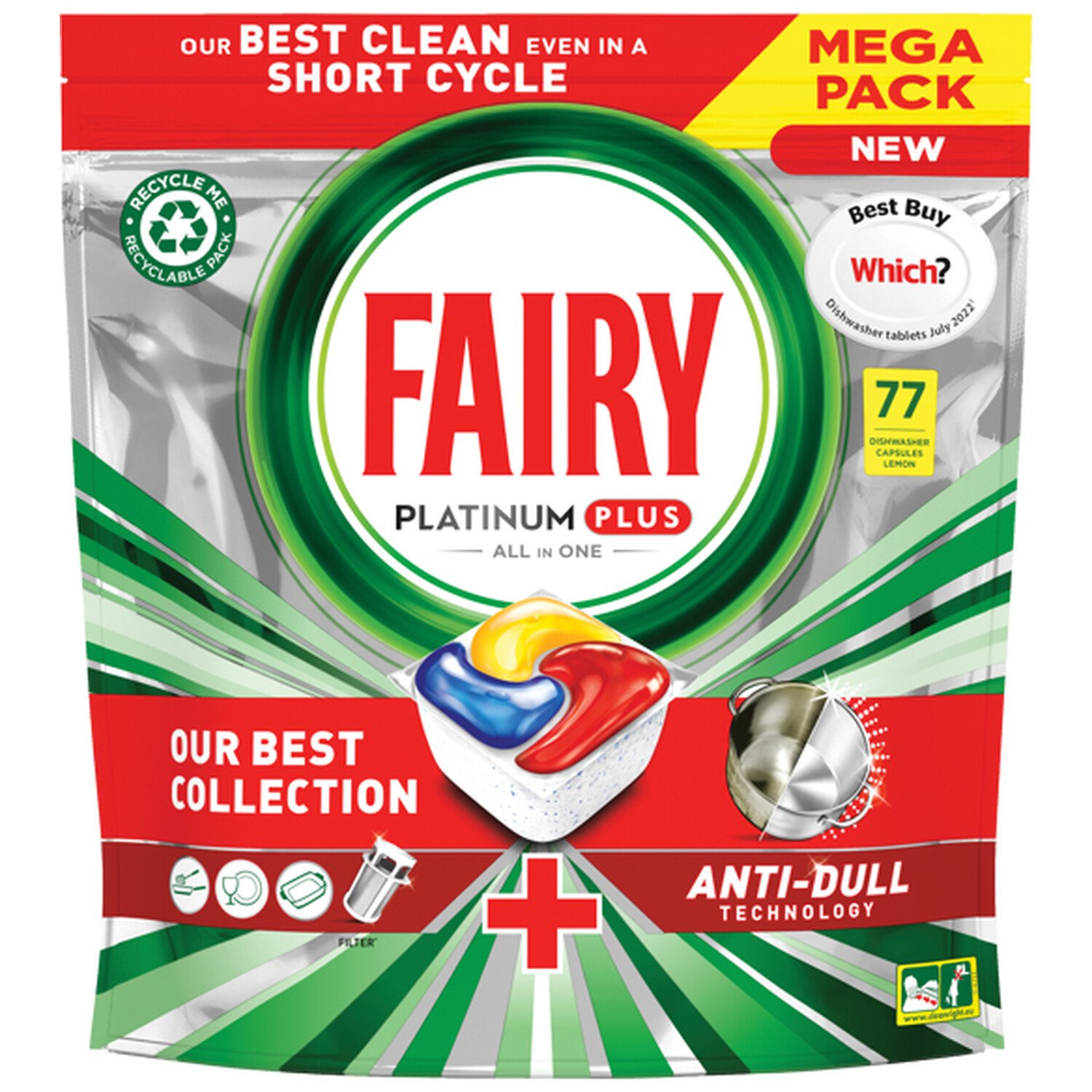 Designed and tested for use on all leading dishwashers, these Fairy Platinum All in One Dishwasher Tablets cut through the toughest grease to get your dishes sparkling. Dissolving faster than hard-pressed tablets with no unwrapping or mess, these tablets have built-in salt and rinse aid action with glass and silver protection and will even keep your dishwasher smelling clean and fresh by preventing grease and limescale build-up.
