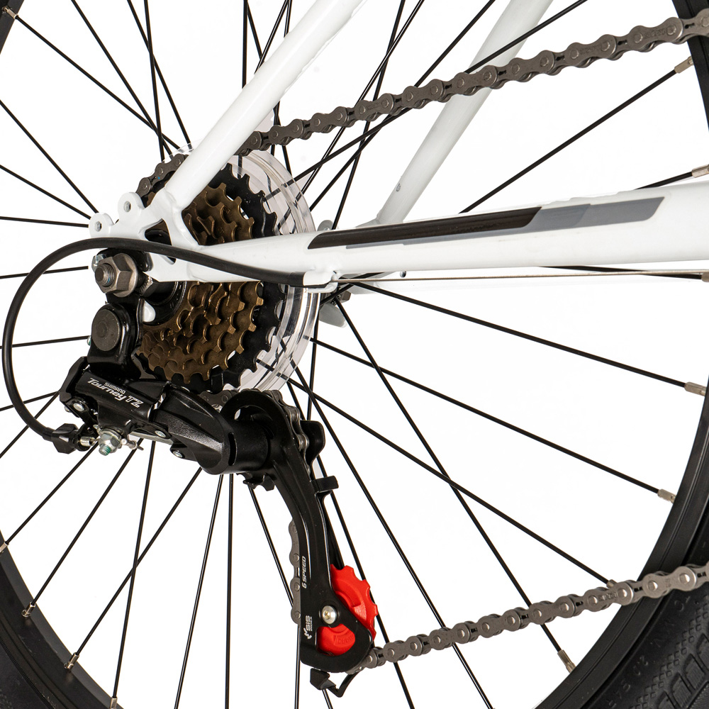 The Falcone Aurora rigid 24” bike has been designed specifically for junior riders aged 9-12 years with a lightweight low-step rigid frame and fork capable of riding longer distances over multiple terrains. The hi-tensile steel frame is strong and durable while the lightweight rigid fork provides a stable ride for kids not used to suspension, whilst reducing vibrations from the pavement thanks to the curved lower section. As well as being great looking, the Aurora has a great spec to match. The six-speed rear gearing is powered by a Shimano rear derailleur and Revoshift shifter, while the front three chainrings give a wide range of gears, perfect for tackling steep hills and fast descents. The chain wheel guard protects fingers and clothes and prevents the chain from slipping off the chainring. MTB-style pedals provide a reassuring grip and the soft compound handlebar grips are durable and comfortable to hold. Braking is taken care of by reliable front and rear V-brakes with specially designed reach-adjustable brake levers that can be adjusted to accommodate smaller hands. The Aurora is ideally suited to fast-growing riders thanks to the longer 250mm seat post, adjustable saddle fore and aft position and quill handlebar stem that can be adjusted up and down to suit. The wheels are assembled with strong yet lightweight alloy rims and grippy all-surface tyres for riding across a variety of terrain. The Falcon Aurora is a cut above the rest and the perfect bike for young riders looking to progress their riding skills before they are big enough for an adult bike. Suitable for kids aged 9-12 years. Inside leg measurements 56-67 cm/22-26″.