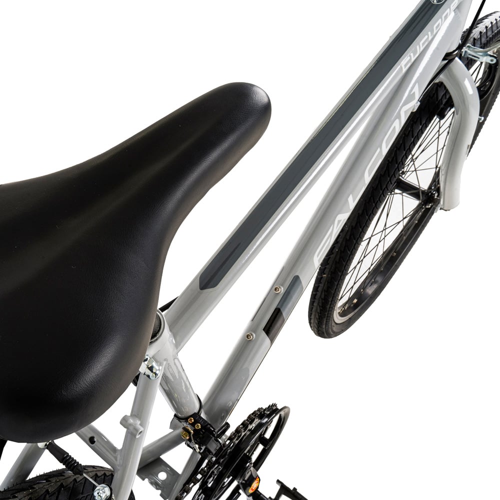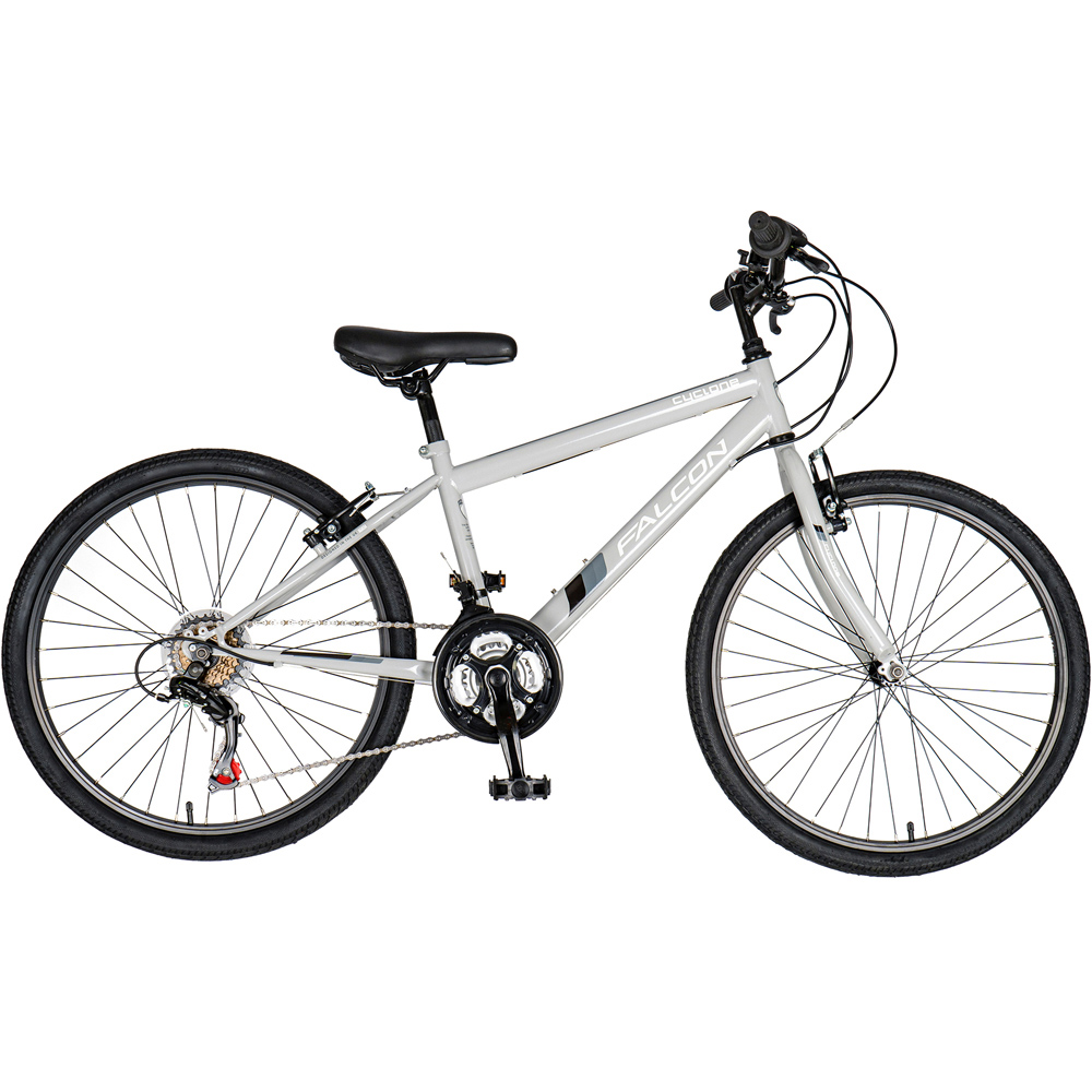The Falcone Cyclone rigid 24” bike has been designed specifically for junior riders aged 9-12 years with a lightweight rigid frame and fork capable of riding longer distances over multiple terrains. The hi-tensile steel frame is strong and durable while the lightweight rigid fork provides a stable ride for kids not used to suspension, whilst reducing vibrations from the pavement thanks to the curved lower section. As well as being great looking, the Cyclone has a great spec to match. The six-speed rear gearing is powered by a Shimano rear derailleur and Revoshift shifter, while the front three chainrings give a wide range of gears, perfect for tackling steep hills and fast descents. The chain wheel guard protects fingers and clothes and prevents the chain from slipping off the chainring. MTB style pedals provide a reassuring grip and the soft compound handlebar grips are durable and comfortable to hold. Braking is taken care of by reliable front and rear V-brakes with specially designed reach-adjustable brake levers that can be adjusted to accommodate smaller hands. The Cyclone is ideally suited to fast-growing riders thanks to the longer 250mm seat post, adjustable saddle fore and aft position and quill handlebar stem that can be adjusted up and down to suit. The wheels are assembled with strong yet lightweight alloy rims and grippy all-surface tyres for riding across a variety of terrain. The Falcon Cyclone is a cut above the rest and the perfect bike for young riders looking to progress their riding skills before they are big enough for an adult bike. Suitable for kids aged 9-12 years. Inside leg measurements 56-67 cm/22-26″.