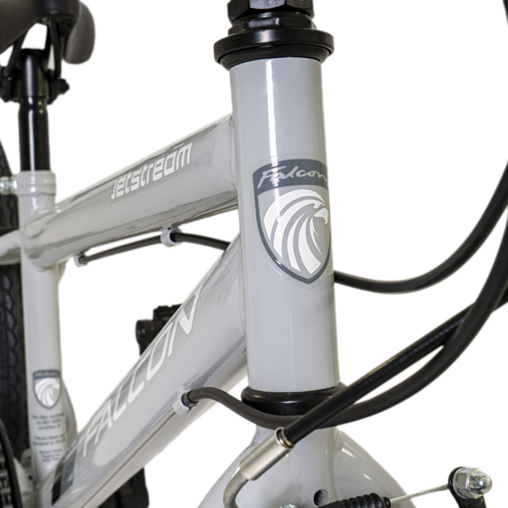 Experience the thrill of open roads with this Falcon Jetstream Light Grey Junior Bike. The bike is an attractive, hard-wearing junior bike and the first range to feature a suspension fork to give young riders a flavour of offroad riding. Strong and durable, it features a hi-tensile steel frame while the suspension fork provides extra comfort when the riding gets rough with a soft spring. Besides being great looking, this bike has competitive specifications to match. The six-speed rear gearing is powered by a Shimano rear derailleur and Revoshift shifter, ensuring smooth gear changes without losing grip on the handlebars. The double-sided chain wheel guard protects fingers and clothes and prevents the chain from slipping off the chainring. Safe for use, braking is taken care of by reliable front and rear V-brakes with specially designed reach-adjustable brake levers that adjust to accommodate smaller hands. Perfect to grow with young riders, thanks to the long 250mm seat post, adjustable saddle fore and aft position and quill handlebar stem that you can modify as required. The wheels are assembled with strong yet lightweight alloy rims and knobbly MTB tyres for extra grip when riding off-road. This bike is a cut above the rest and perfect for young riders looking to progress in their riding off-road and learn how to use gears. Suitable for ages six to nine years.