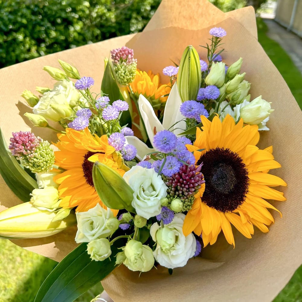 - Features sunflowers, allium, aster, lily, and lisianthus