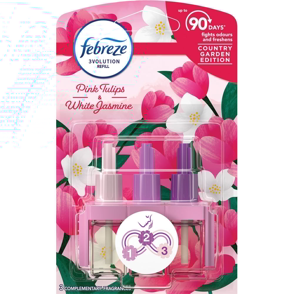 Transform your home with the uplifting scent of the Febreze 3Volution Plug In Refill Pink Tulips and White Jasmine Air Freshener 20ml 3 Pack. This refill pack continuously eliminates odours and alternates between three complementary scents for freshness that lasts up to 90 days. It is a refreshing and perfect floral blend for any space.