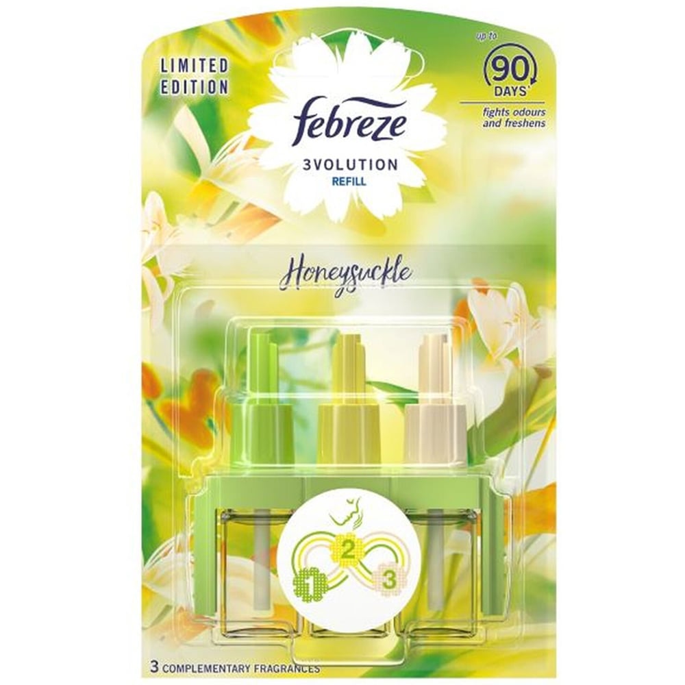 Keep your home smelling fresh and welcoming for up to 90 days with this Febreze 3Volution Plug-In Air Freshener Refill. It features a lovely Honeysuckle fragrance that cleans away tough, lingering odours and replaces them with a light, lovely scent. On top of that, it alternates between three scents every 45 minutes, and you can easily adjust the intensity to meet your needs. Size: 20ml.