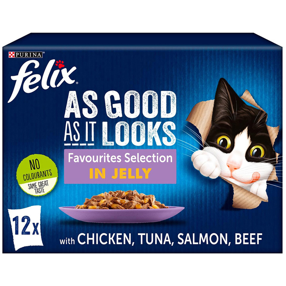 Treat your cat to Felix As Good As It Looks Favourites Selection in Jelly 12 Pack, a delicious variety of fish and meaty meals packed with omega 6, vitamins D and E. Each pouch offers 100% complete, balanced nutrition to support your cat’s health and vitality every day.