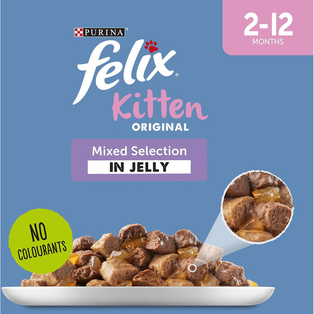 Support your kitten’s healthy start with Felix Kitten Mixed Selection in Jelly. Each pack includes 12 flavourful pouches featuring cod, plaice, chicken, and lamb- perfectly tailored for young cats. With essential nutrients, vitamins, and no artificial colours or flavours, it’s a tasty, balanced way to fuel their playful energy and growing needs.