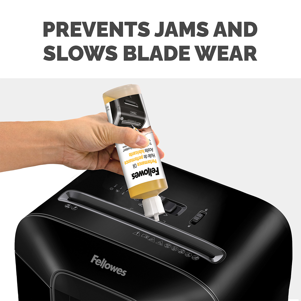 Maintain your home and office shredders with the Fellowes Powershred Bottled Lubricant 120ml. Regular lubrication of your shredder cutters is essential to maintain peak shredding performance. This shredder oil conditions the cutters to extend the life of your shredder. You should use this oil shredder each time you empty the waste basket or a minimum twice a month. To oil your shredder, simply hold down the reverse button. Squeeze oil across the entire paper entry while holding down the button. Hold down the reverse button for another ten seconds to ensure the lubrication has spread through the cutters. It is ideal for use with all cross-cut and micro-cut shredders.
