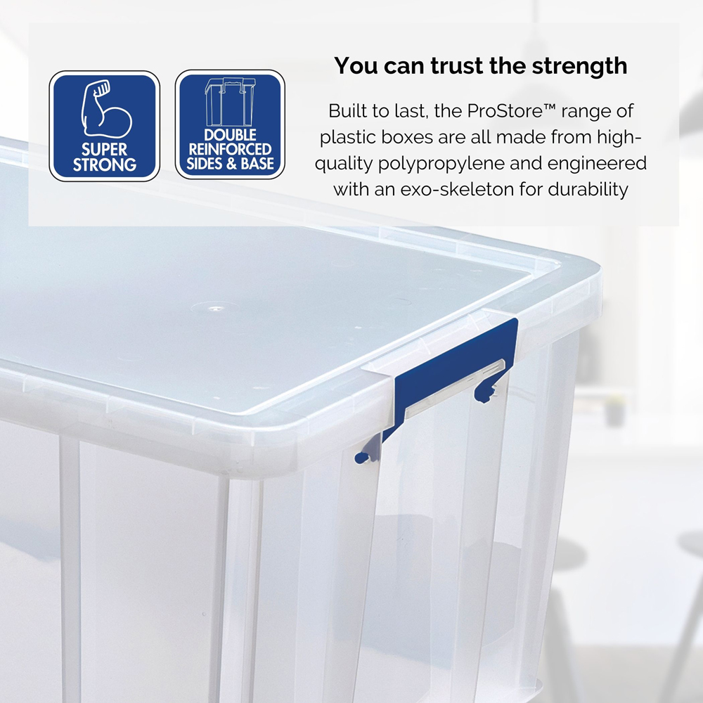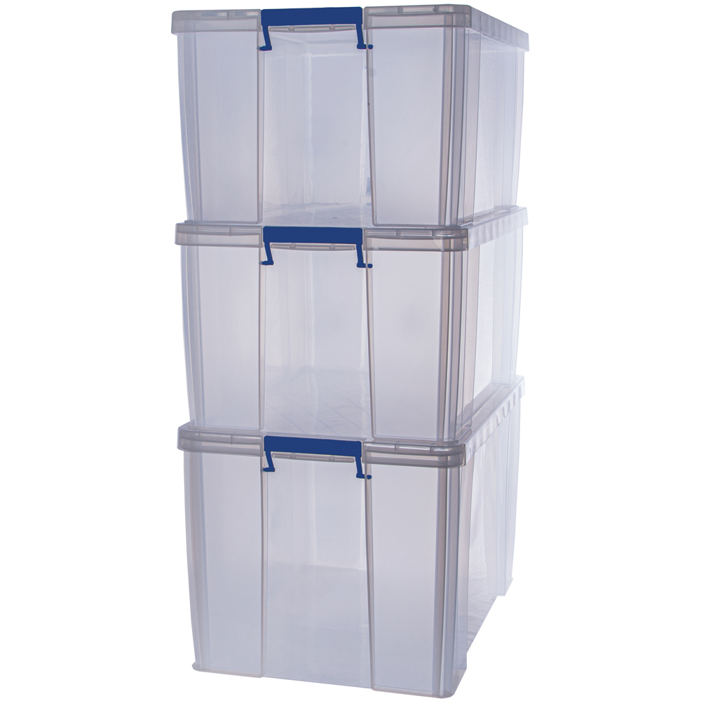 Introduce a durable and versatile storage solution with the Fellowes Prostore 70L and 85L Storage Box with Lid 3 Pack. Made from impact-resistant polypropylene, these strong 85L and two 70L boxes are built to last. Their double-reinforced base and corners make them stackable, maximising floor space. The clip-lock clamps securely lock the lids, keeping the contents dust and moisture-free. Ideal for filing and archiving in various settings, these BPA-free and food-safe storage boxes are fully recyclable. They are designed to store a variety of items, from paperwork and files to tools and soft furnishings. This pack contains two 70L boxes and an 85L box, offering a versatile storage solution for your needs. Internal dimensions: For 85L: H37.5 x W57.5 x D38cm. For 70L: H30 x W48 x D38.5cm.