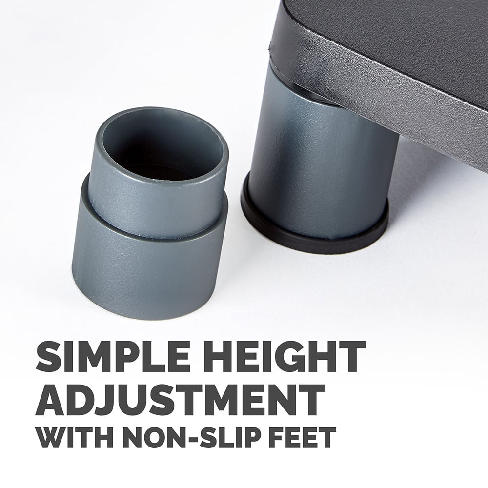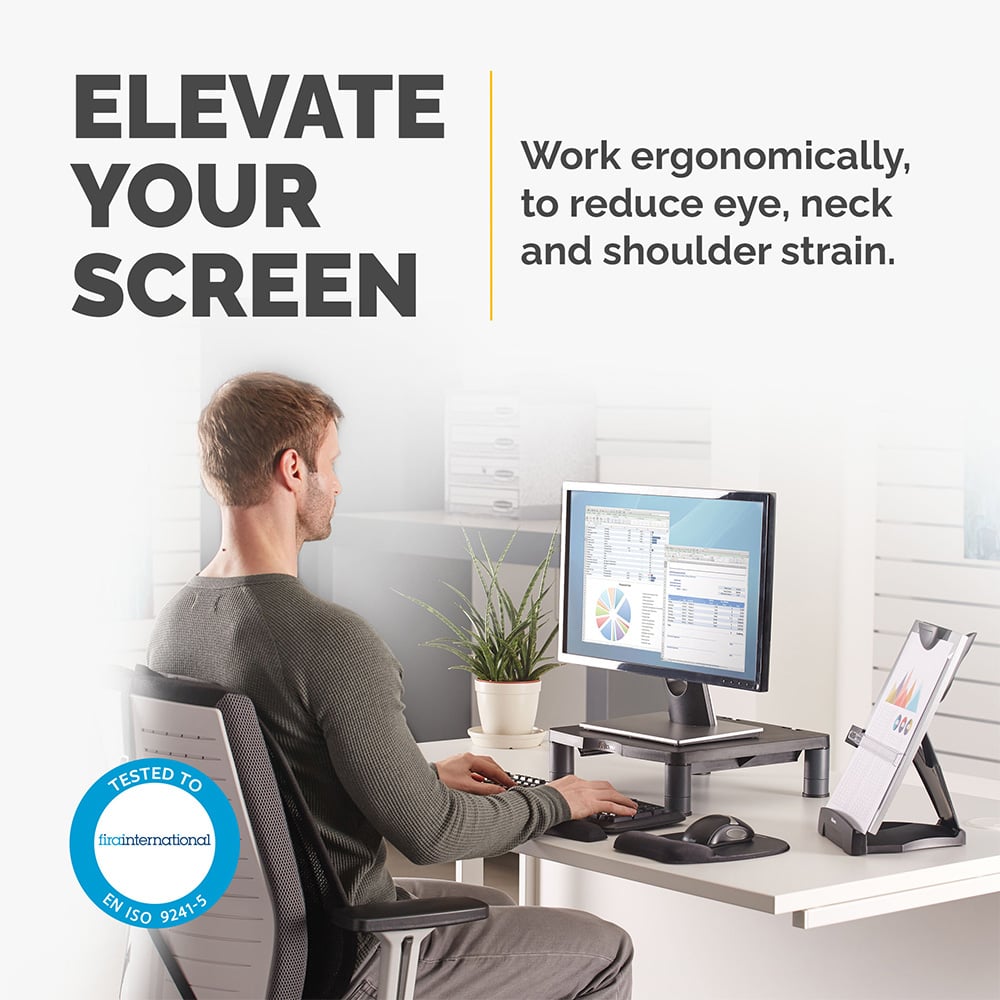 Elevate your home and office work experience with the Fellowes Standard Monitor Stand Graphite. Positioning your screen incorrectly can put a serious strain on your eyes, neck and shoulders. This computer monitor stand allows you to place your monitor in a more ergonomically correct viewing position. This adjustable monitor stand can support up to a 21 inch CRT, TFT or LCD monitor with a maximum weight capacity of 27kg. It features non-skid foot rings ensuring stability on any surface. You can work at the ideal viewing angle that suits your needs. This standard computer stand features three height adjustable settings between 5 to 10cm, allowing you to find a comfortable screen position. This monitor riser is made from 100% recycled plastic so you can be sure your ergonomic solution is environmentally friendly and safe.