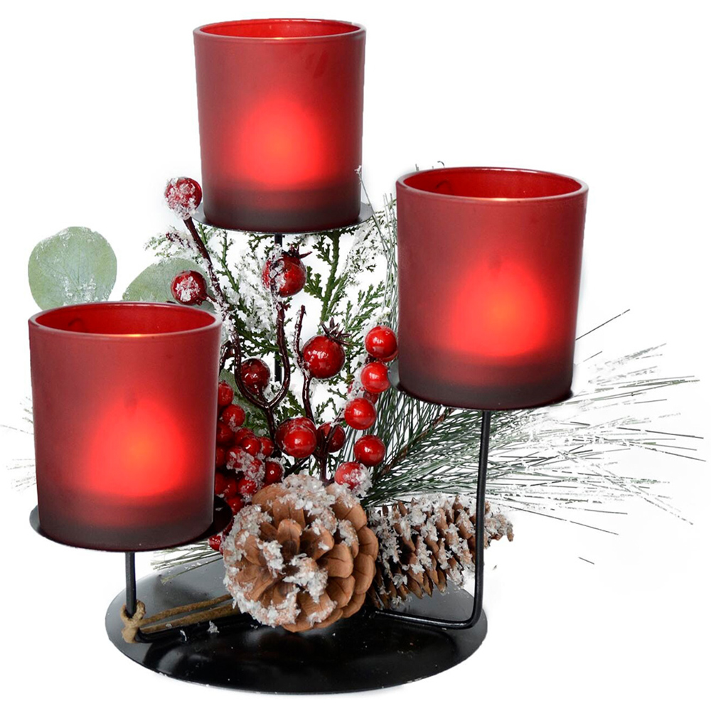 The Festive Red Berry Triple Candle Set is a great item to bring a festive look to your home. Featuring traditional Christmas tones such as red and green, this traditionally inspired ornament is the perfect size for your tealight or votives to bring a warm and cosy atmosphere to your home. Finished with a pinecone and glitter detailing, this would make a beautiful centrepiece for your dinner or accent table.