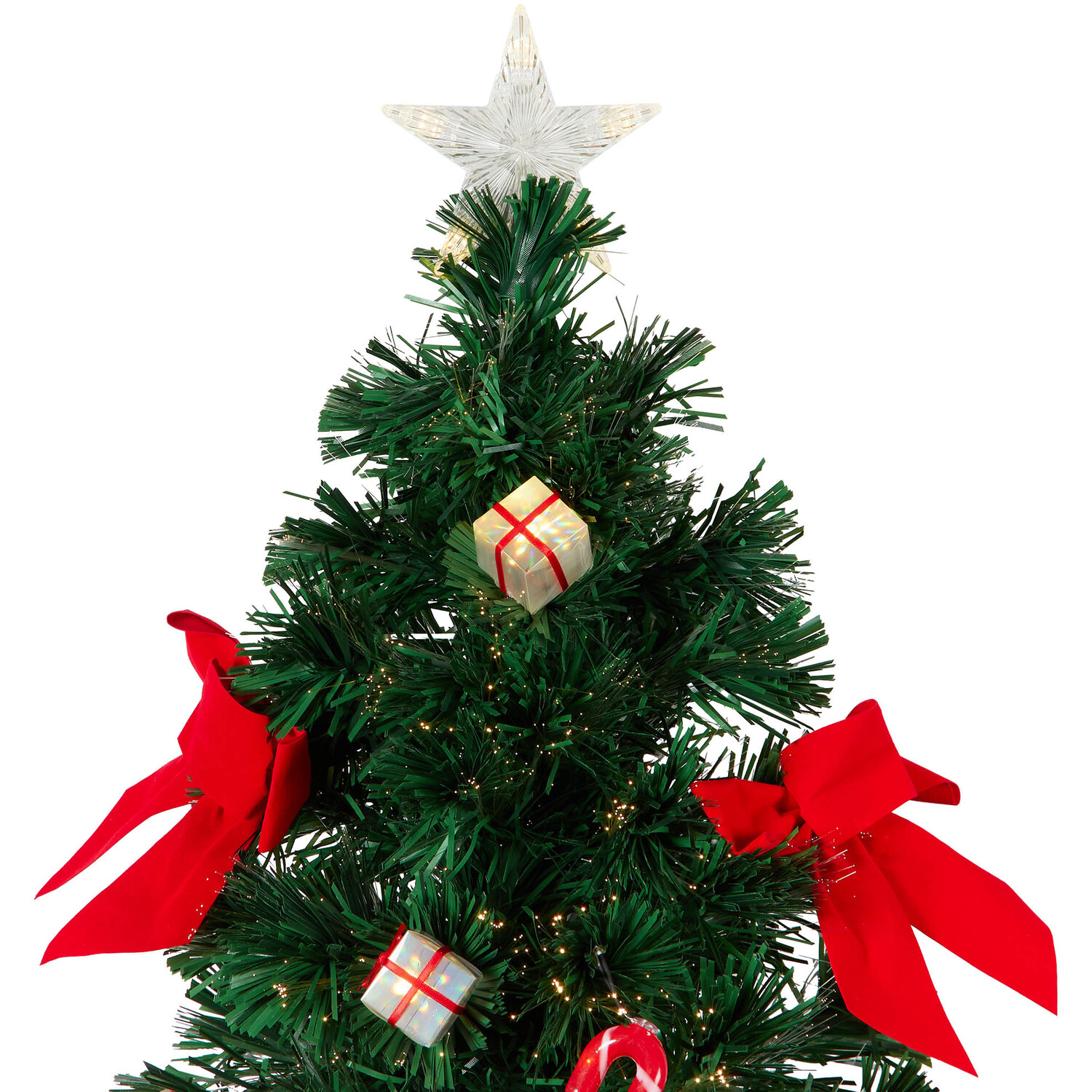 Brighten up your holiday season with this Fibre Optic Candy Cane Tree 4ft. This eye-catching tree is adorned with 48 warm white fibre optics and LEDs that create a festive glow. Decorated with miniature presents, candy canes, and red bows, it adds a delightful touch to your décor. It brings a vibrant and cheerful atmosphere to any room.