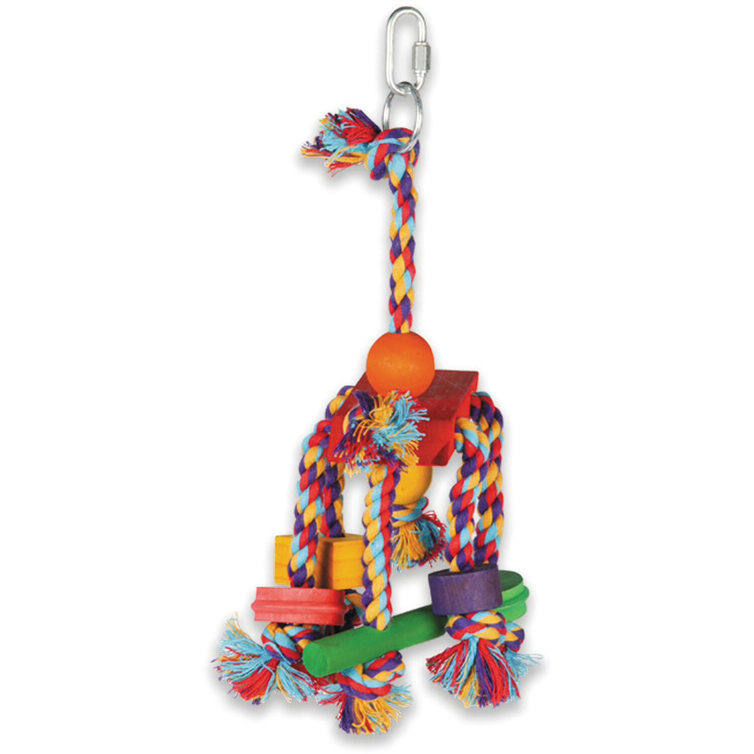 This Fiesta Bird Toy is recommended for parrots and larger birds. This brightly coloured toy is made from wood and rope and has been designed using non-toxic colours and dyes. Guaranteed to encourage natural chewing, shredding and playing, the Fiesta Bird Toy will prevent unwanted feather picking. A great accessory to brighten up your bird's cage, it's quick and easy to attach thanks to the metal clasp.