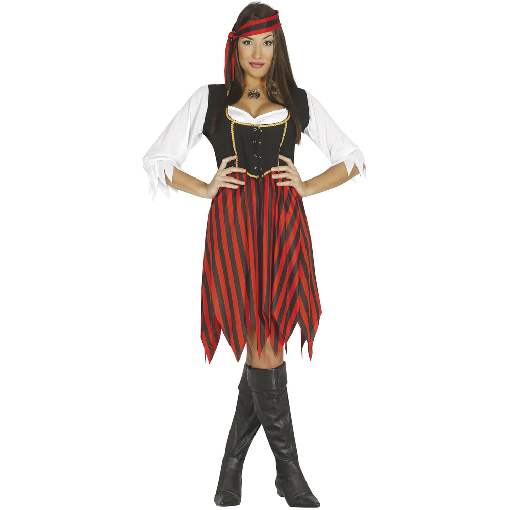 Embrace your inner pirate with this Red and Black Adult Overseas Pirate costume, size 38-40 (M). Made from comfy polyester, it includes a shirt, ribbons, a corset, and a skirt, making it easy to create a fantastic look. Perfect for themed events or just having fun, this outfit helps you transform effortlessly.