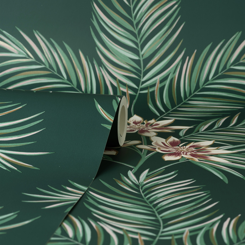 Transform your walls with Fine Decor Bali Tropical Floral Emerald Wallpaper. Inspired by the lush tropics of nature, it is a stunning wallpaper showcasing beautiful hand-painted flowers surrounded by an elegant fan of palm leaves. The matte backgrounds contrast with the embellished highlights of brushed metallic to create a vibrant and striking statement to any room.