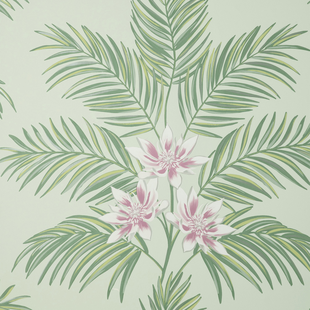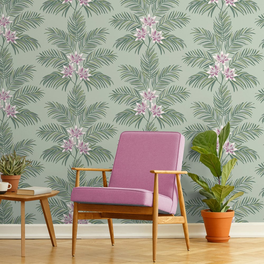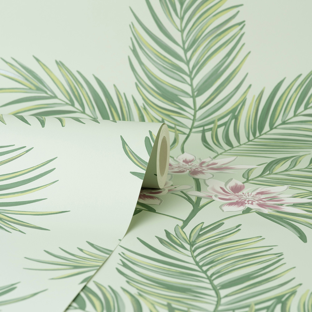 Transform your walls with Fine Decor Bali Tropical Floral Sage Wallpaper. Inspired by the lush tropics of nature, it is a stunning wallpaper showcasing beautiful hand-painted flowers surrounded by an elegant fan of palm leaves. The matte backgrounds contrast with the embellished highlights of brushed metallic to create a vibrant and striking statement to any room.