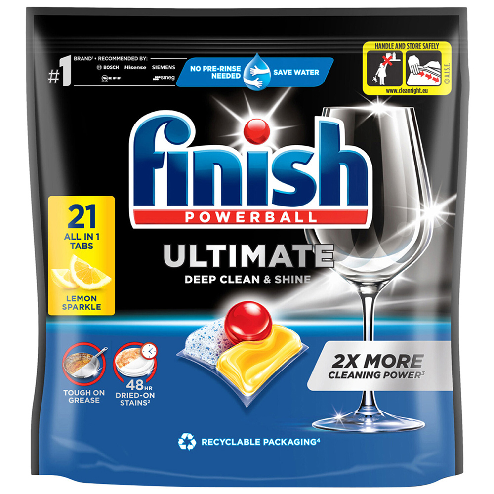 Clean your dishes easily with Finish Powerball Ultimate Deep Clean and Shine Lemon Dishwasher Tablets 21 Pack. Make sure your dishes sparkle with the Pack of 50 Finish Powerball Ultimate Dishwasher Tablets Lemon. These tablets use advanced technology to clean efficiently, without needing any pre-rinsing. With a fresh lemon scent, they ensure your dinnerware is perfectly cleaned and smells great.