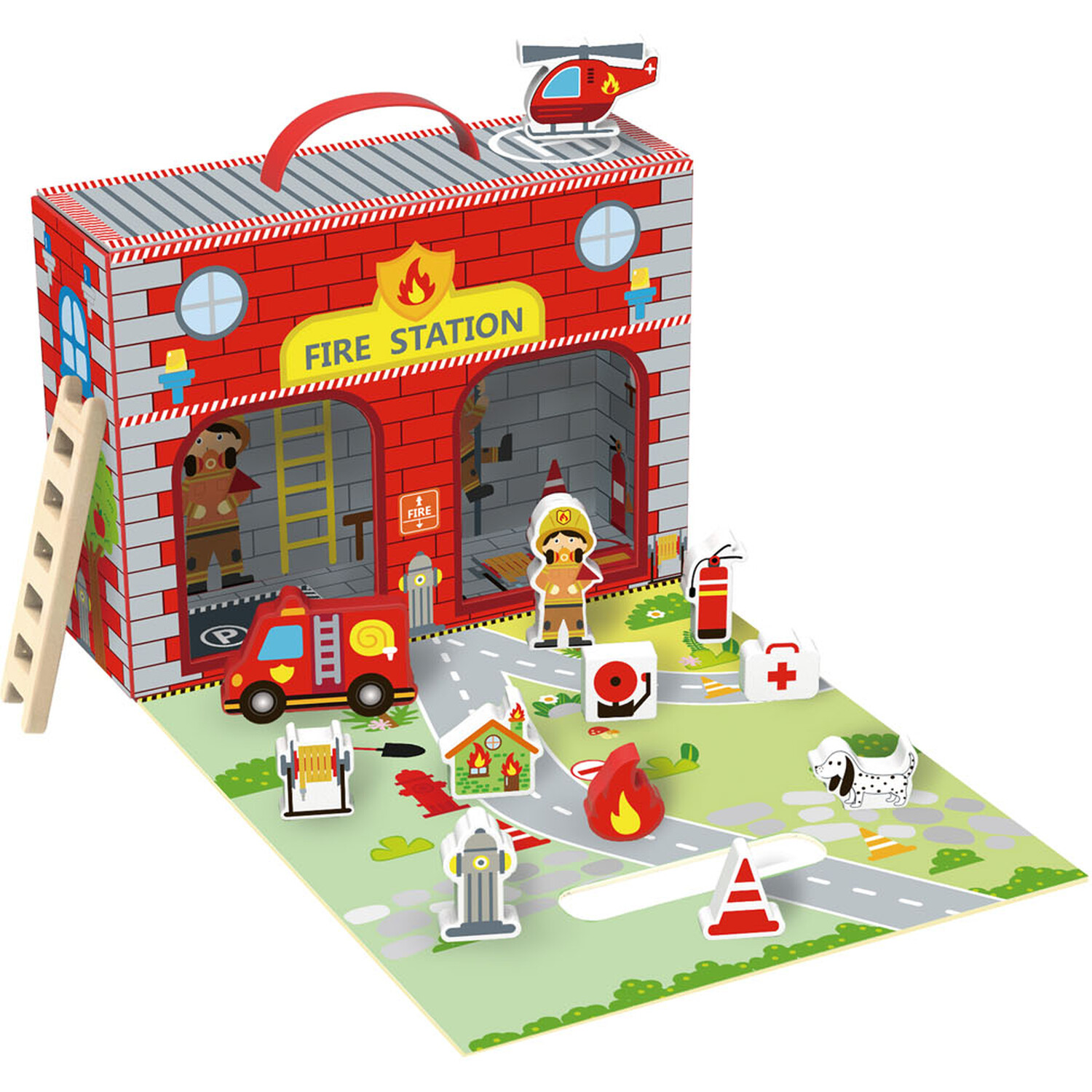 Perfect for helping children develop their imagination, this Fire Station Box makes a great addition to their toy collection. The box features 13 pieces and is portable and easy to travel with as it folds back up as a carrying case for fun on the go. Handcrafted with durable quality wood and child-safe paints, your child can come up with a variety of stories in this simple yet fun playset.
