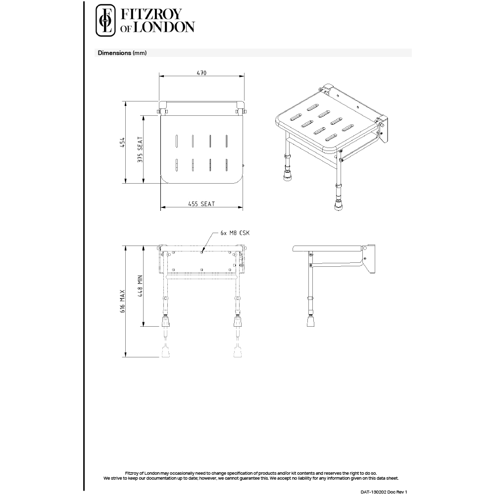 Fitzroy of London Grey Wall Mounted Padded Shower Seat with Legs