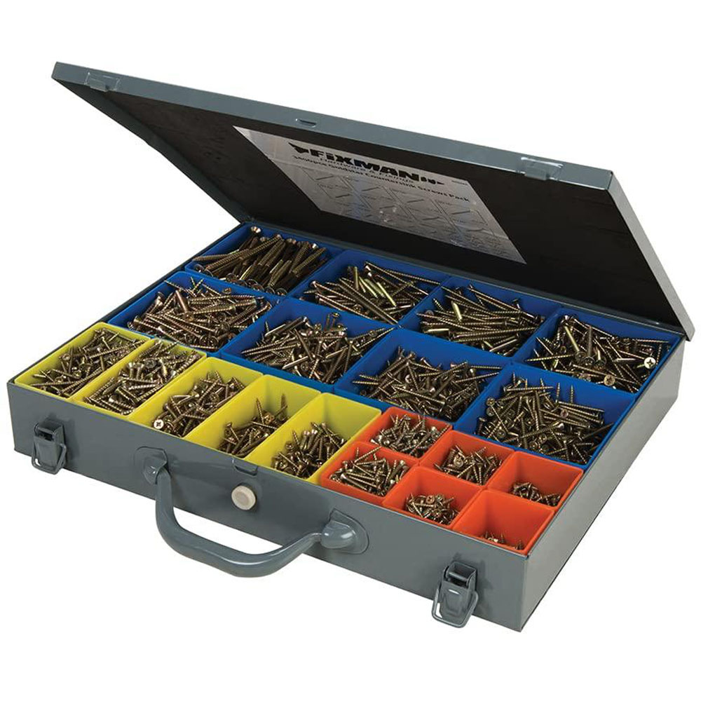 Yellow zinc passivated for corrosion resistance Single-thread, case-hardened PZD countersunk screws Sizes 3 x 12, 3.5 x 12, 16, 20, 25, 30 and 40 mm, 4 x 20, 25, 30, 40, 45 and 50 mm, 5 x 30, 50, 60, 70 and 80 mm, 6 x 100 mm Sturdy metal case with removable plastic compartments.